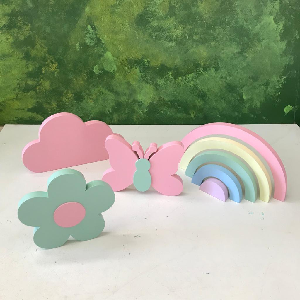 Kit Decorativo Arco Íris Flor e Borboleta Para Prateleira Mesa Decoração Quarto Infantil Bebe