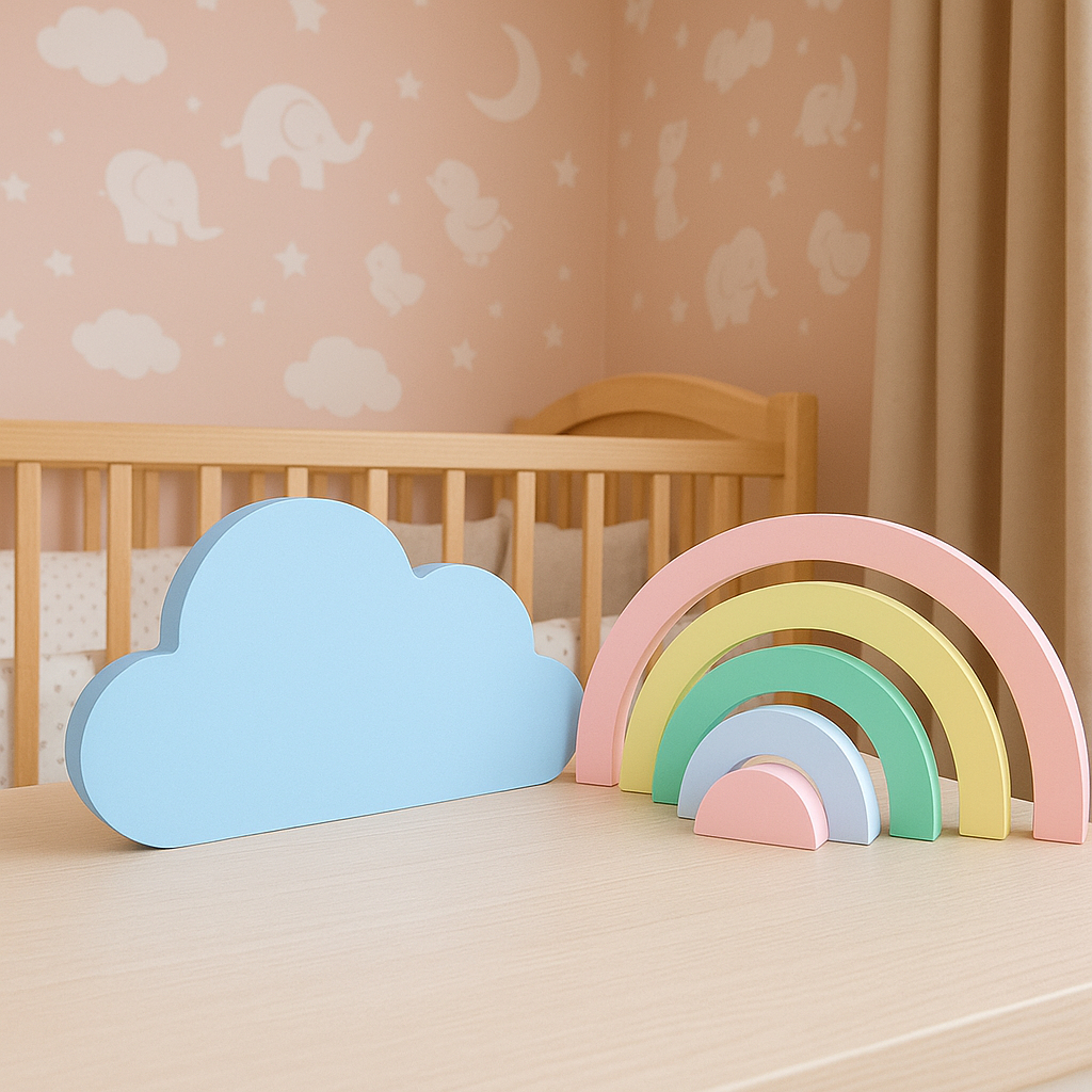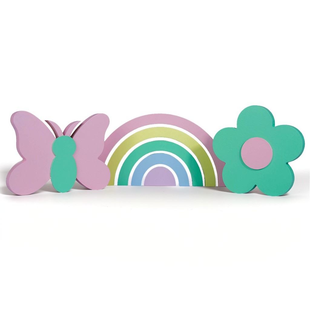 Kit De Enfeites Arco Íris Flor Borboleta Para Prateleira Mesa Decoração Quarto Infantil Bebe Em Mdf