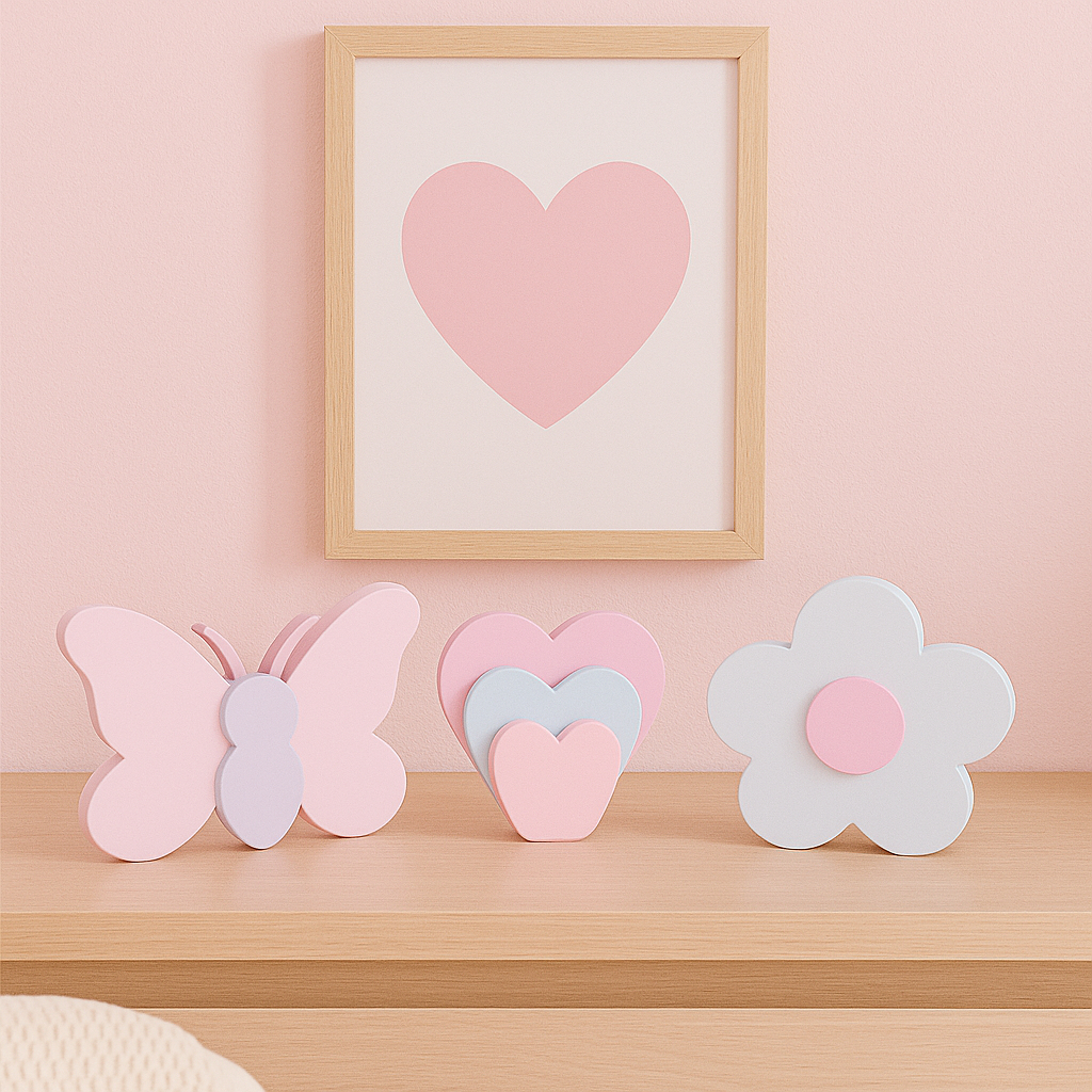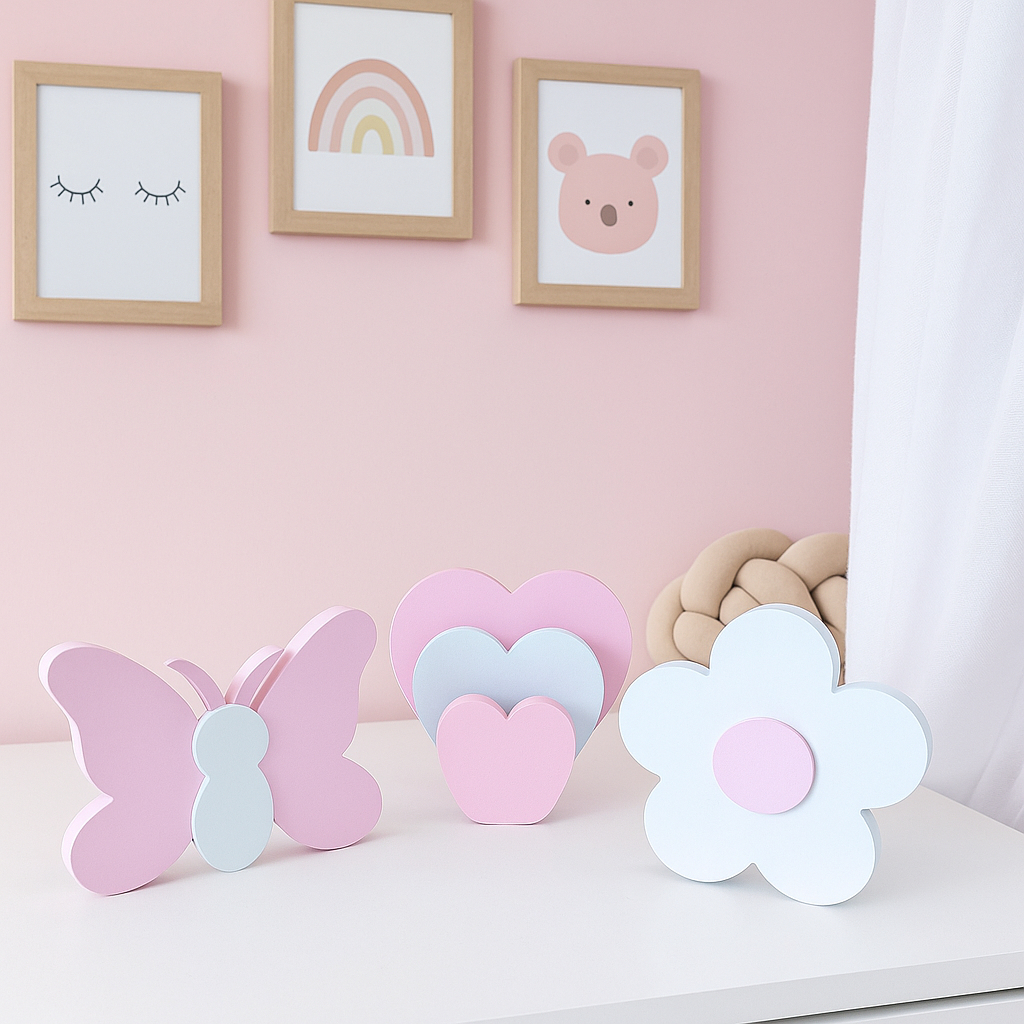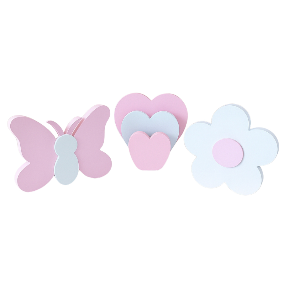 Kit Decoração Infantil Para Prateleira Flor Borboleta Trio Coração Quarto Brinquedoteca