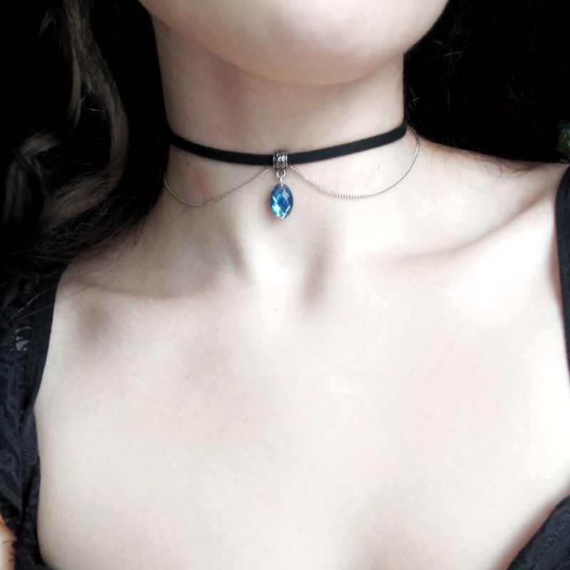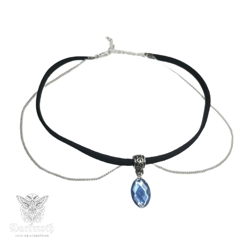 Colar Gargantilha Choker com Corrente e Pingente Azul Chaton Oval