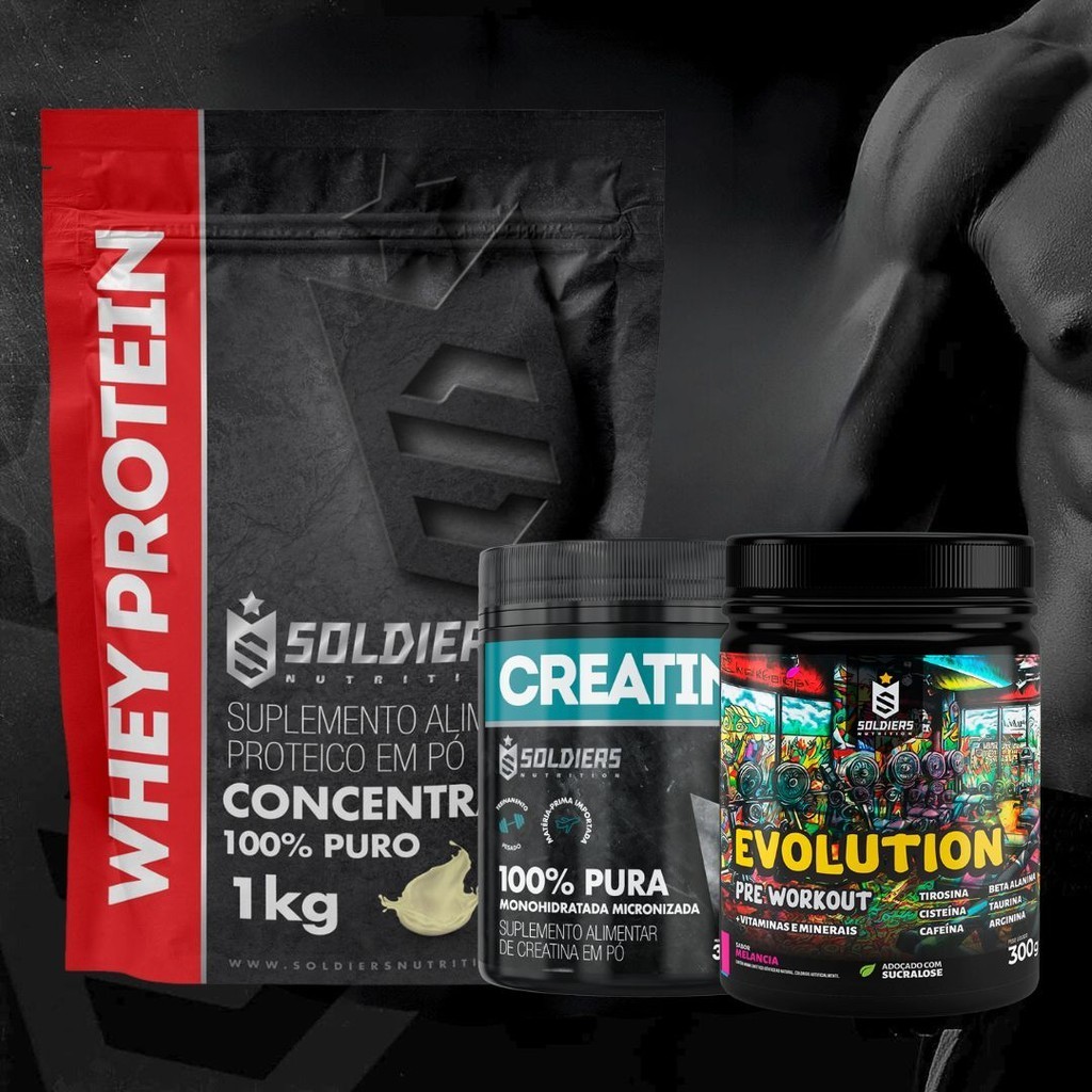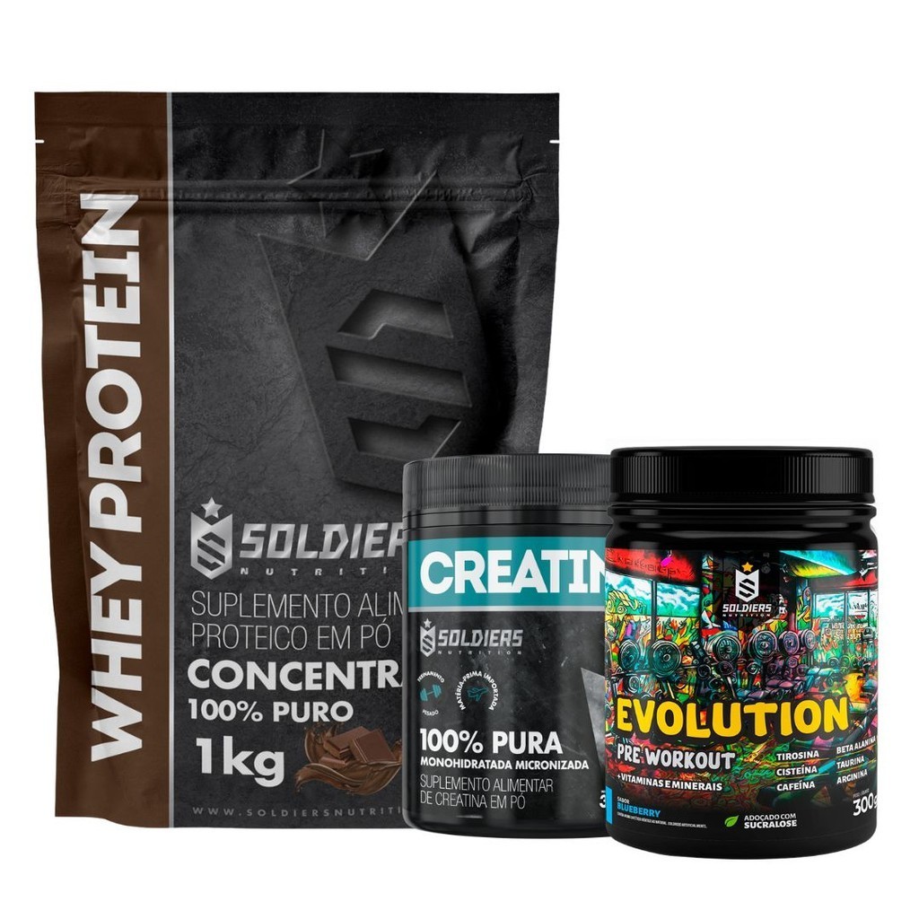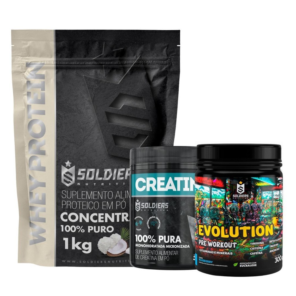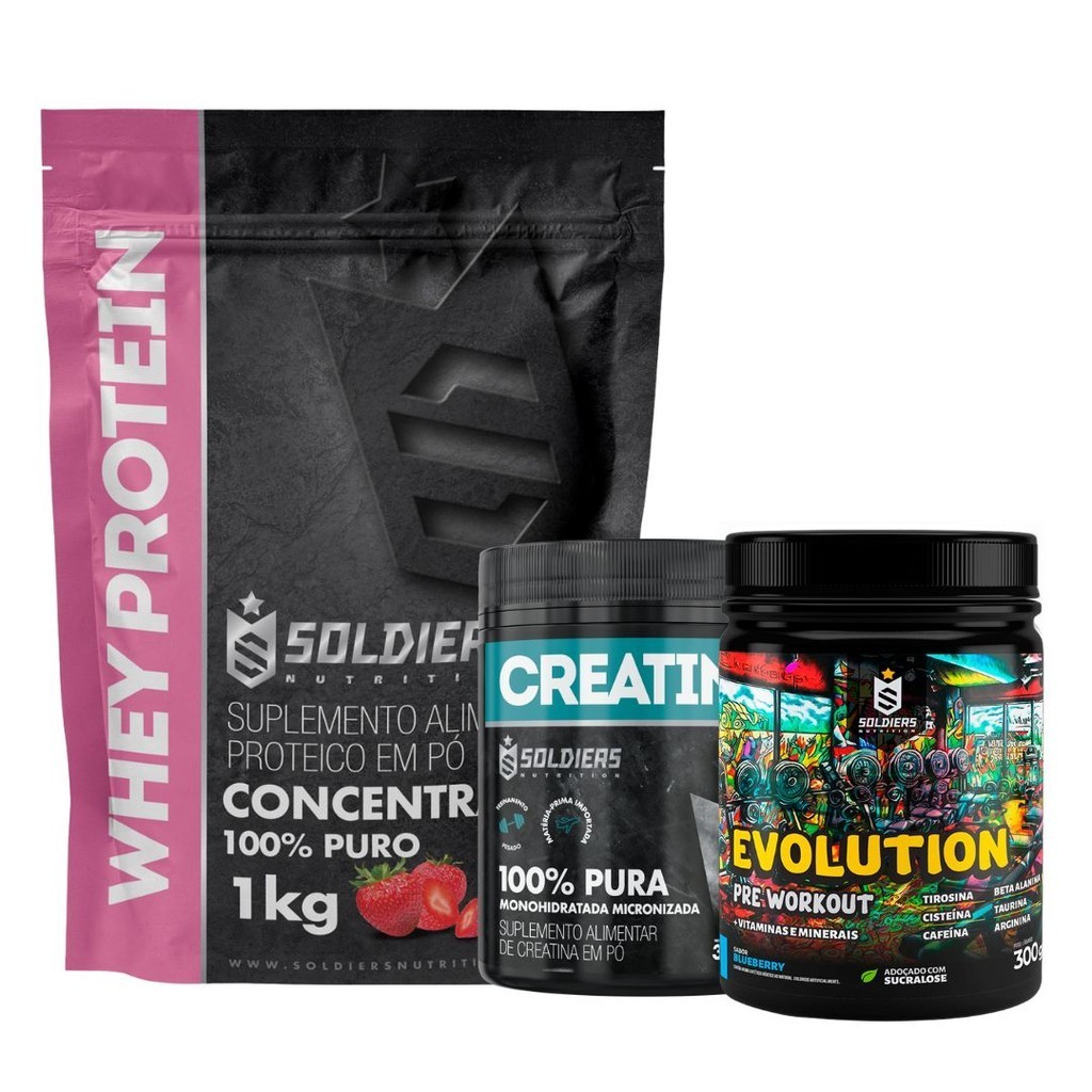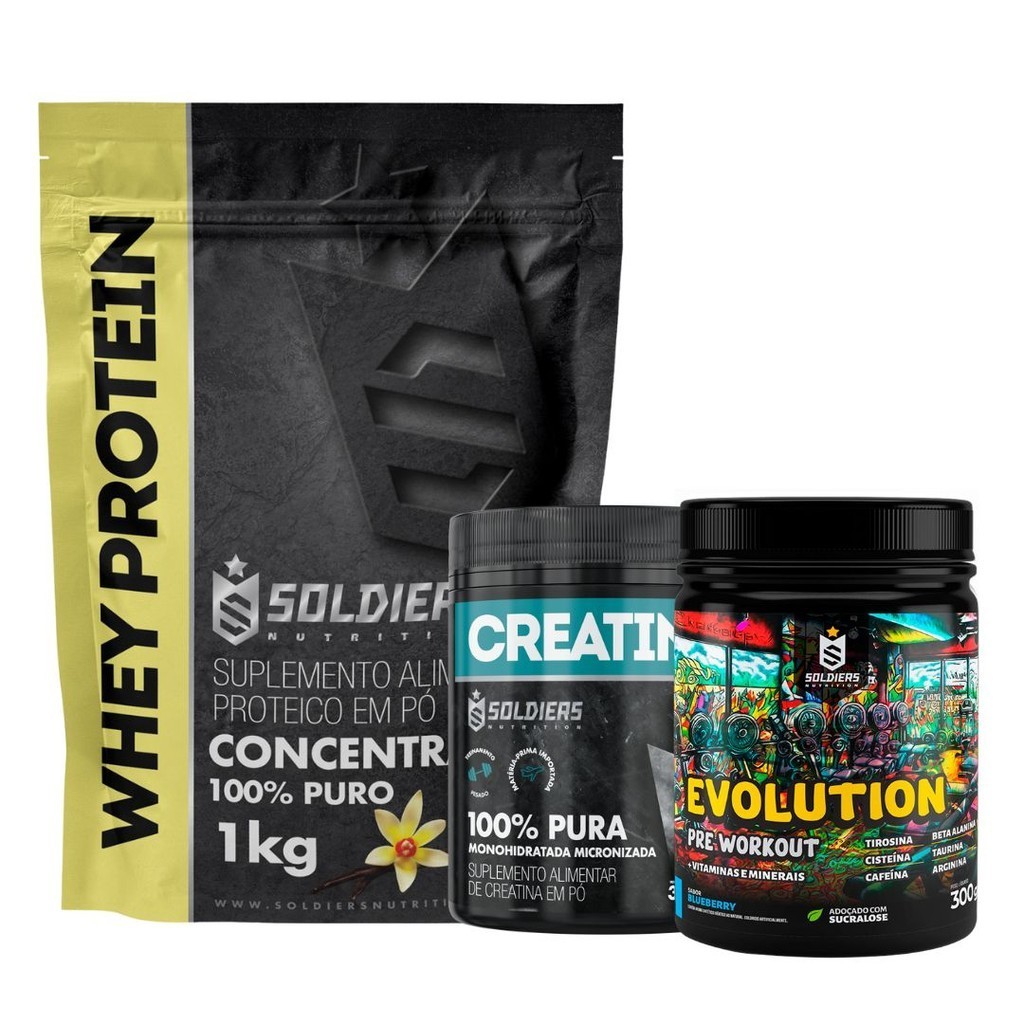 Kit: Whey Protein Concentrado 1kg + Creatina 300g + Pré Treino Evolution Pré Workout 300g Soldiers Nutrition Força