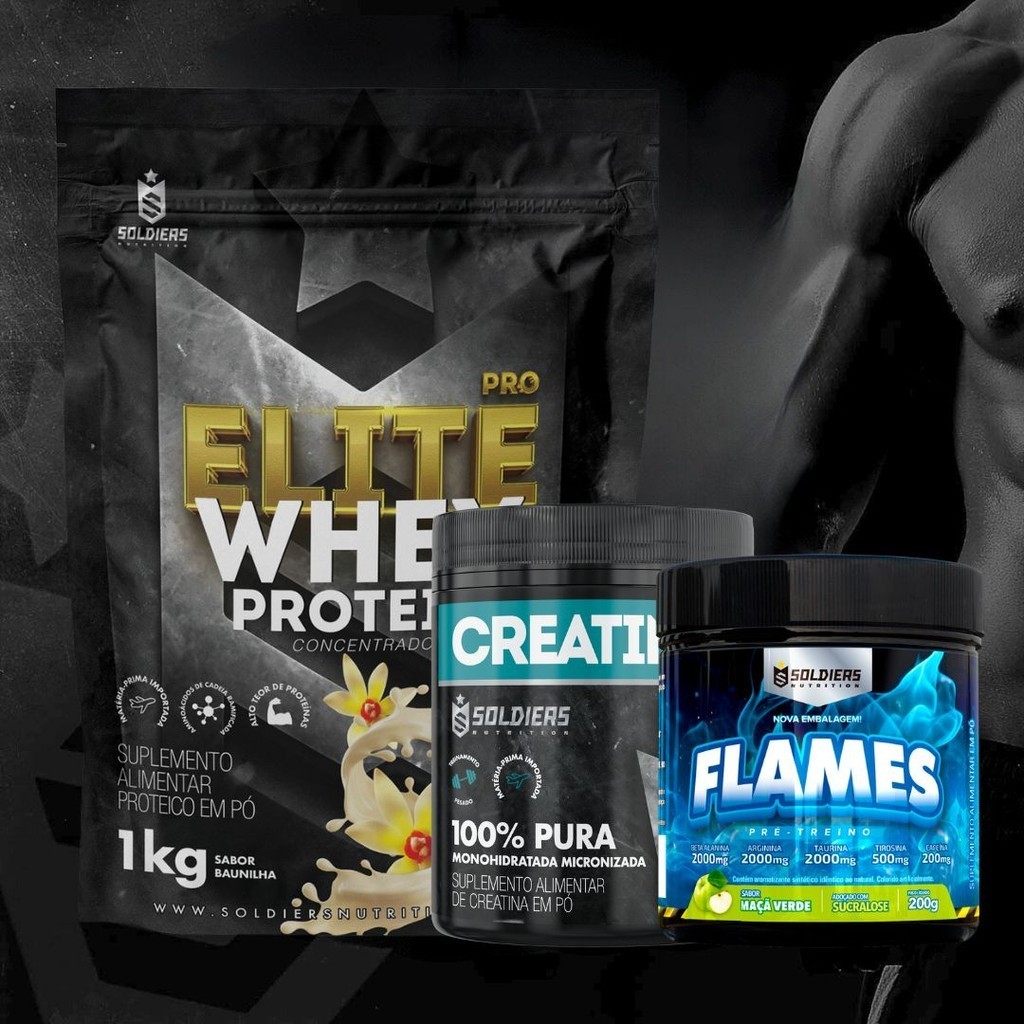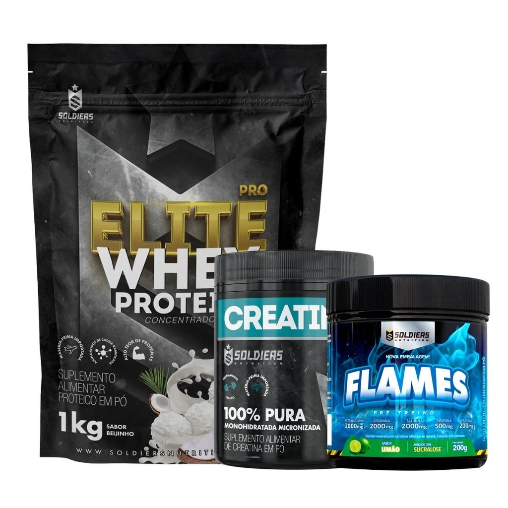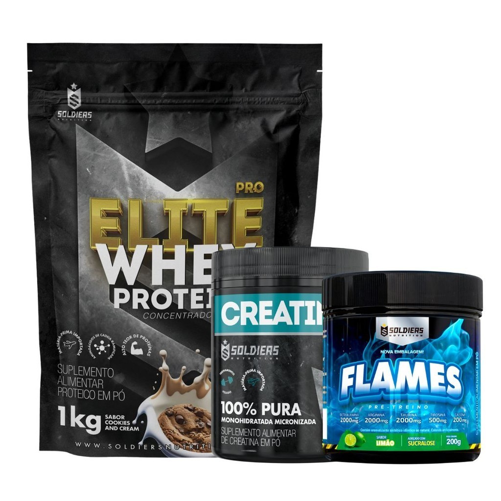Kit: Whey Protein Concentrado Elite 1kg + Creatina 300g + Pré Treino Flames 200g Soldiers Nutrition Força Performance