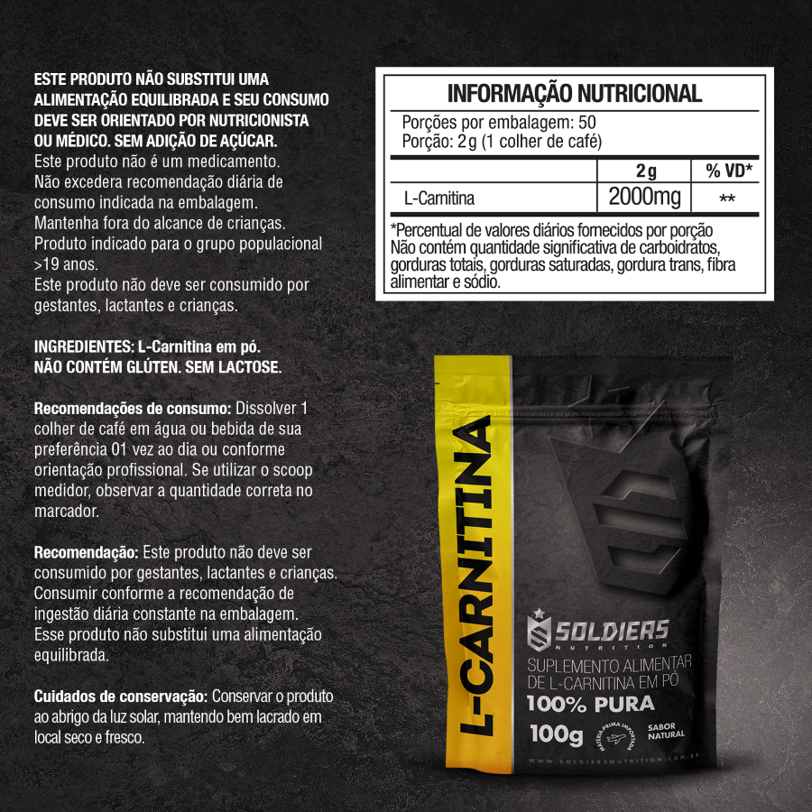 L-Carnitina 100g 100% Puro Importado Soldiers Nutritions Aminoácido Suplemento Nutricional Recuperação Muscular
