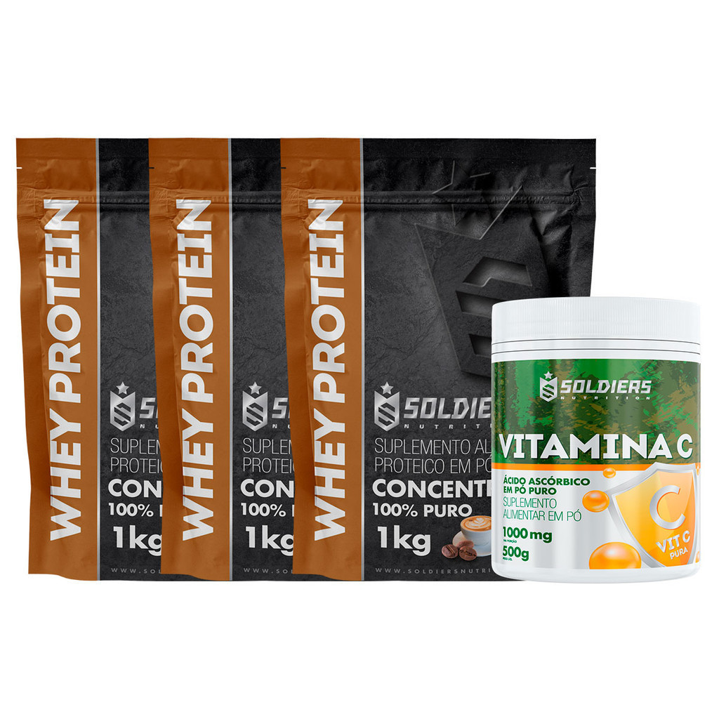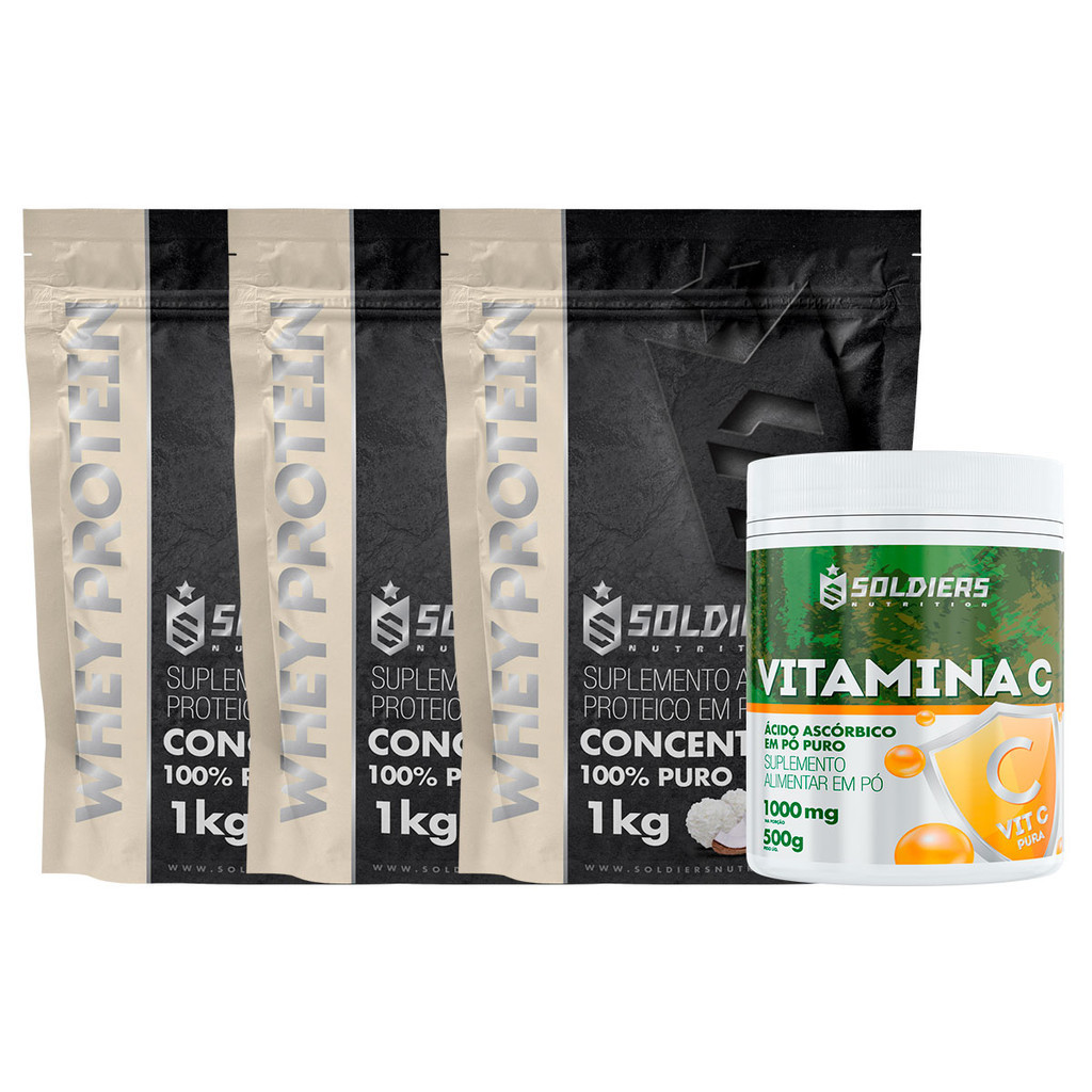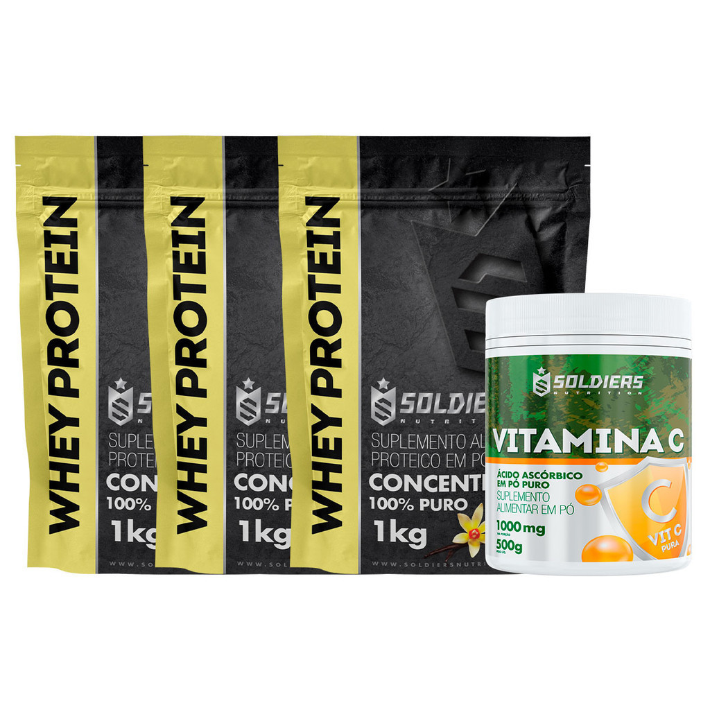 Kit: Whey Protein Concentrado 3kg + Vitamina C 500g Soldiers Nutrition Proteína Muscular