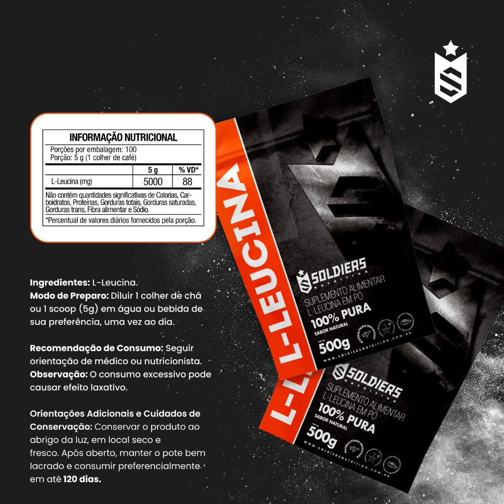 L-Leucina 500g 100% Pura Importada Soldiers Nutrition Aminoácido Suplemento Nutricional Recuperação Muscular