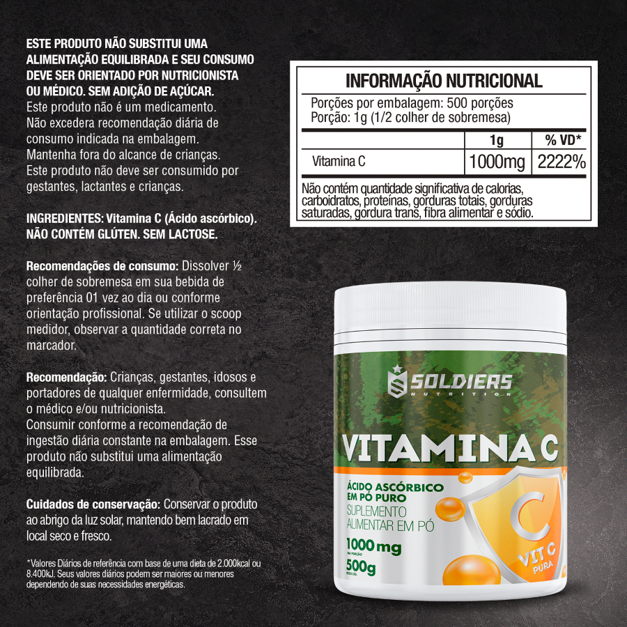 Vitamina C em Pó Ácido Ascórbico 500g 100% Puro Importado Soldiers Nutrition Multivitamínico Completo Saúde Imunidade