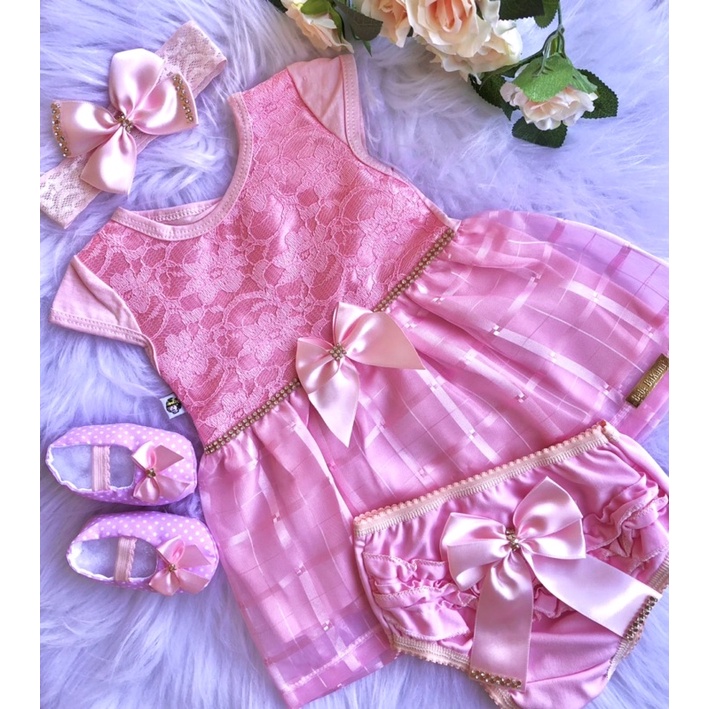 vestido para bebês com sapatinho calcinha tiara e laço.