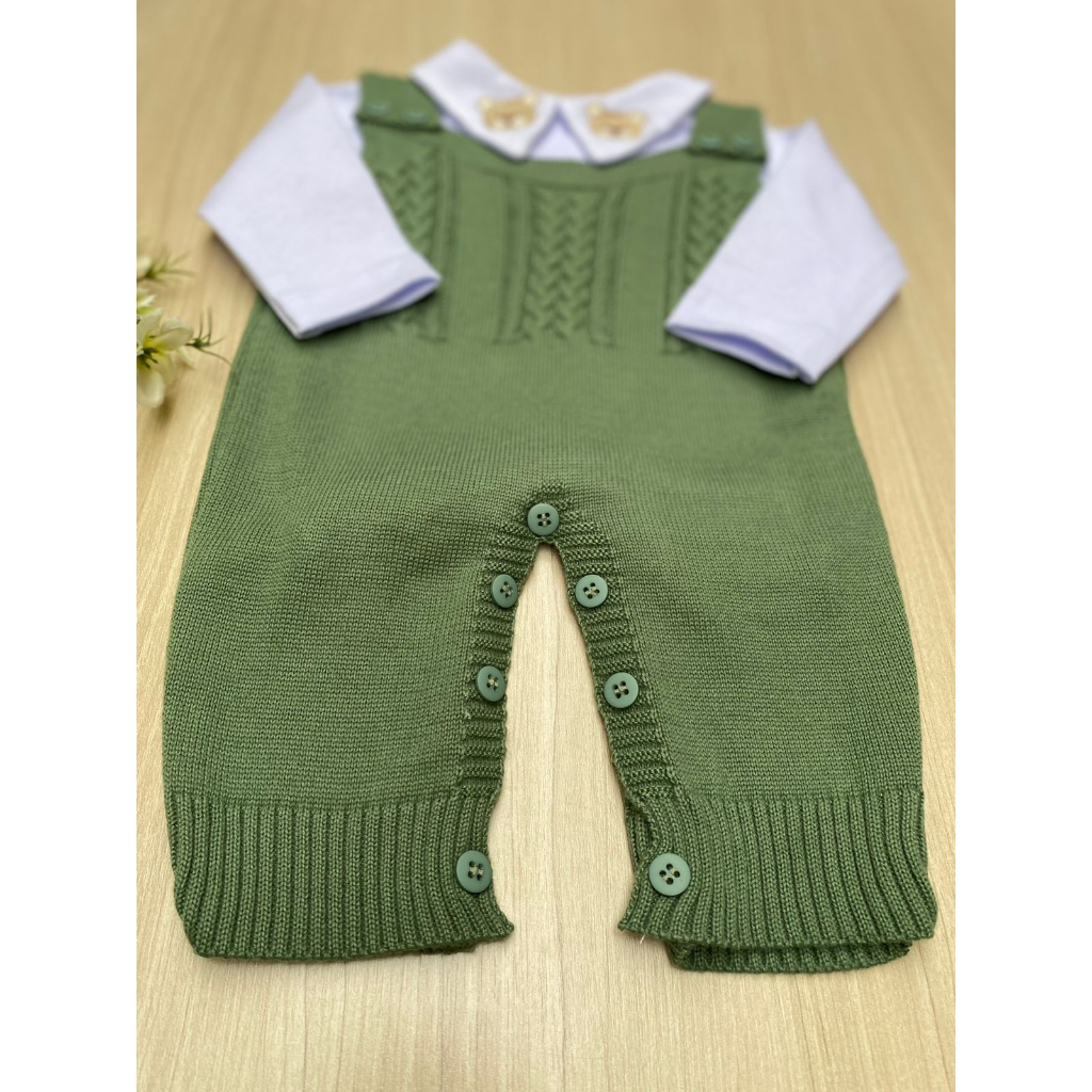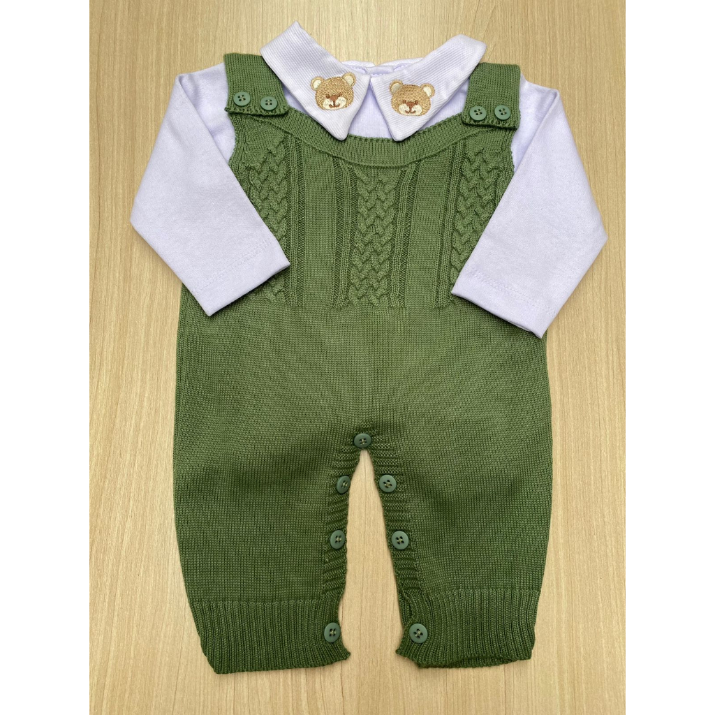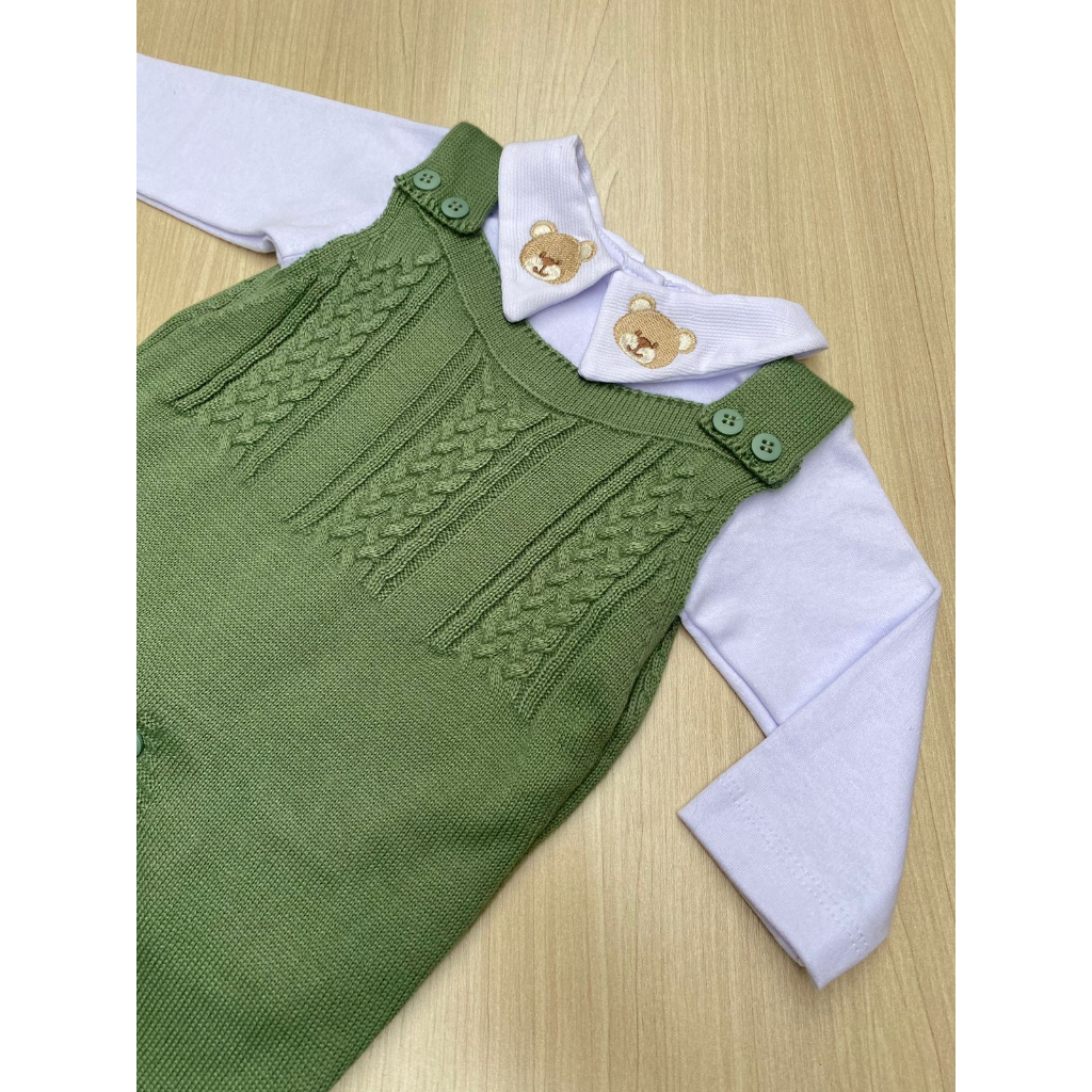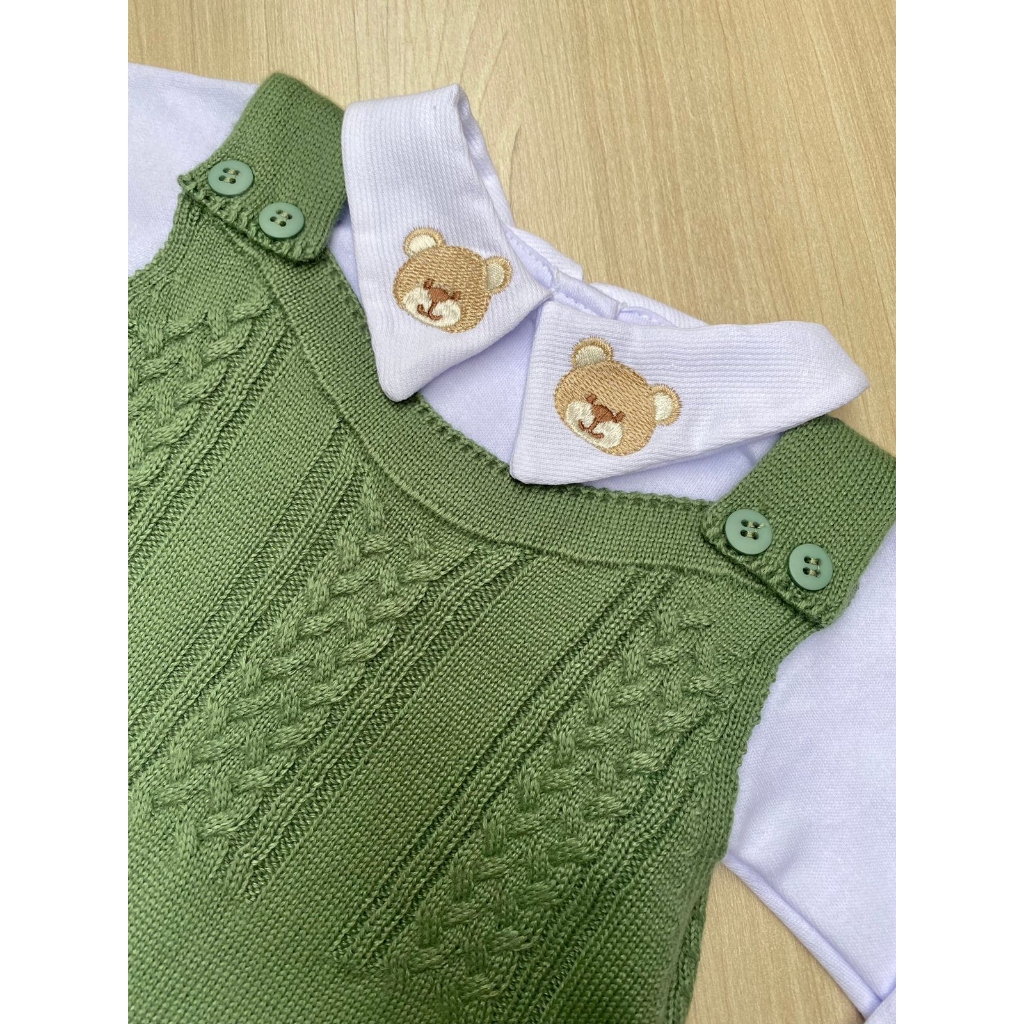Saída de Maternidade Menino Jardineira Verde Pistache Urso Tricot 2 Peças