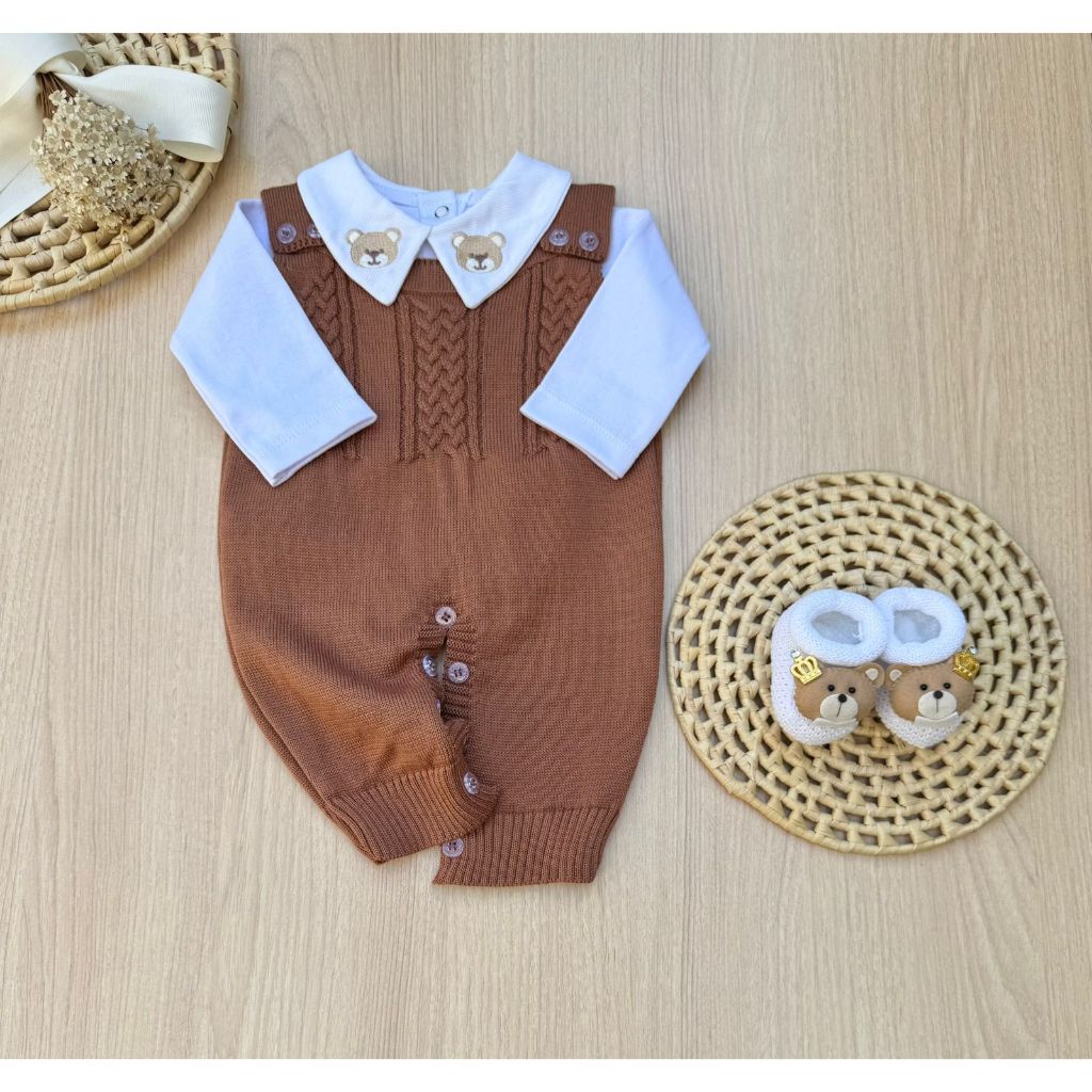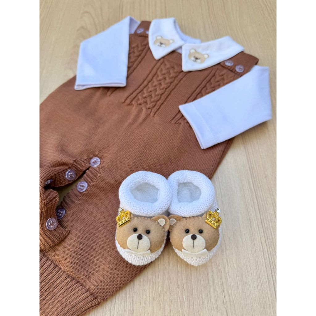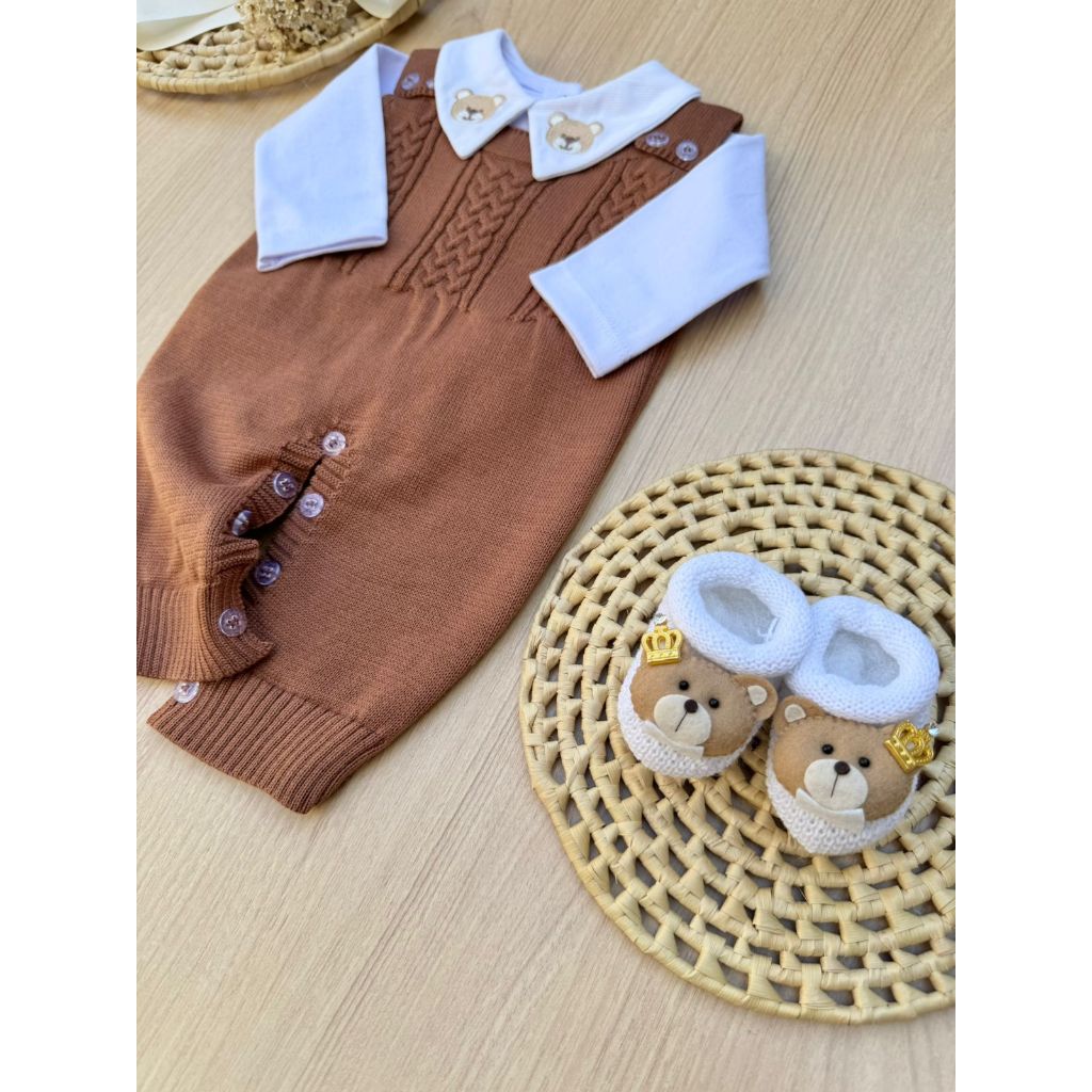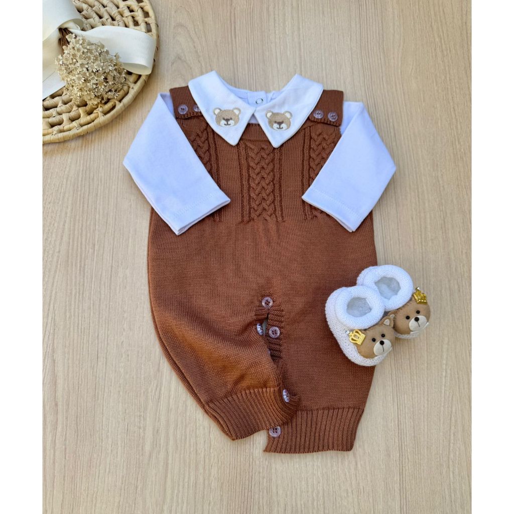 Saída de Maternidade Menino Jardineira Madrid marrom Urso Tricot 3 Peças