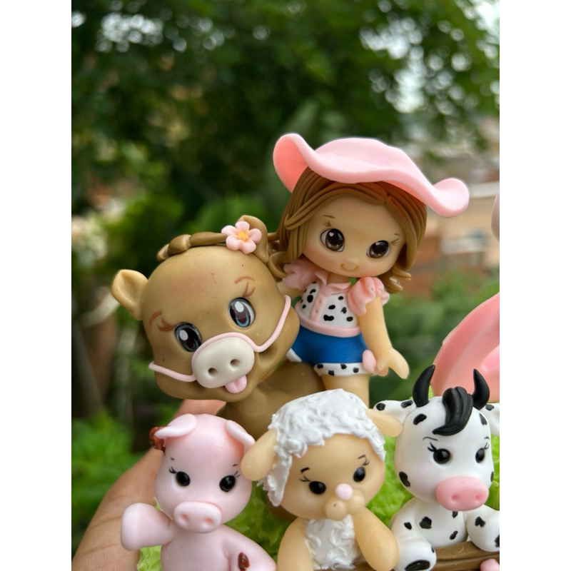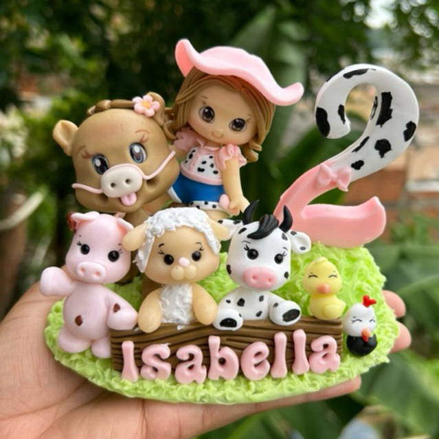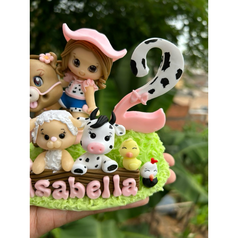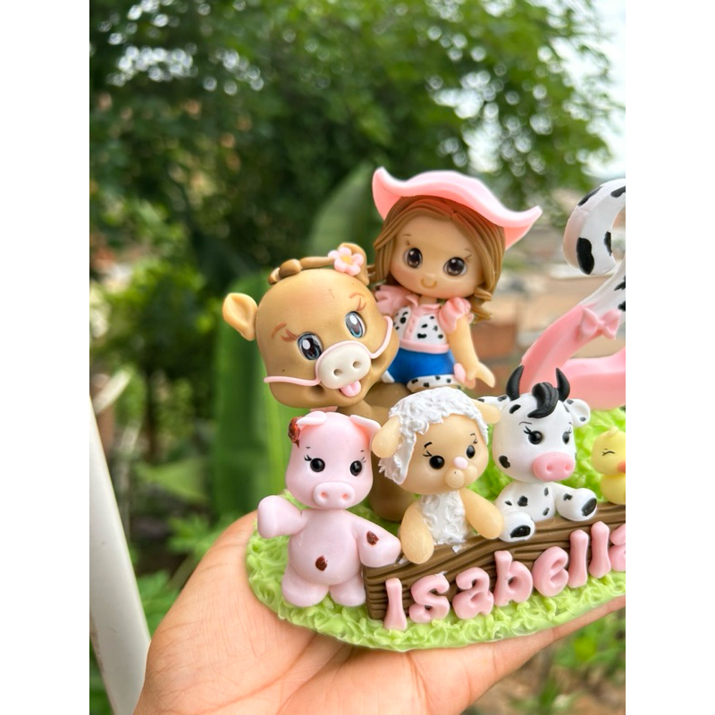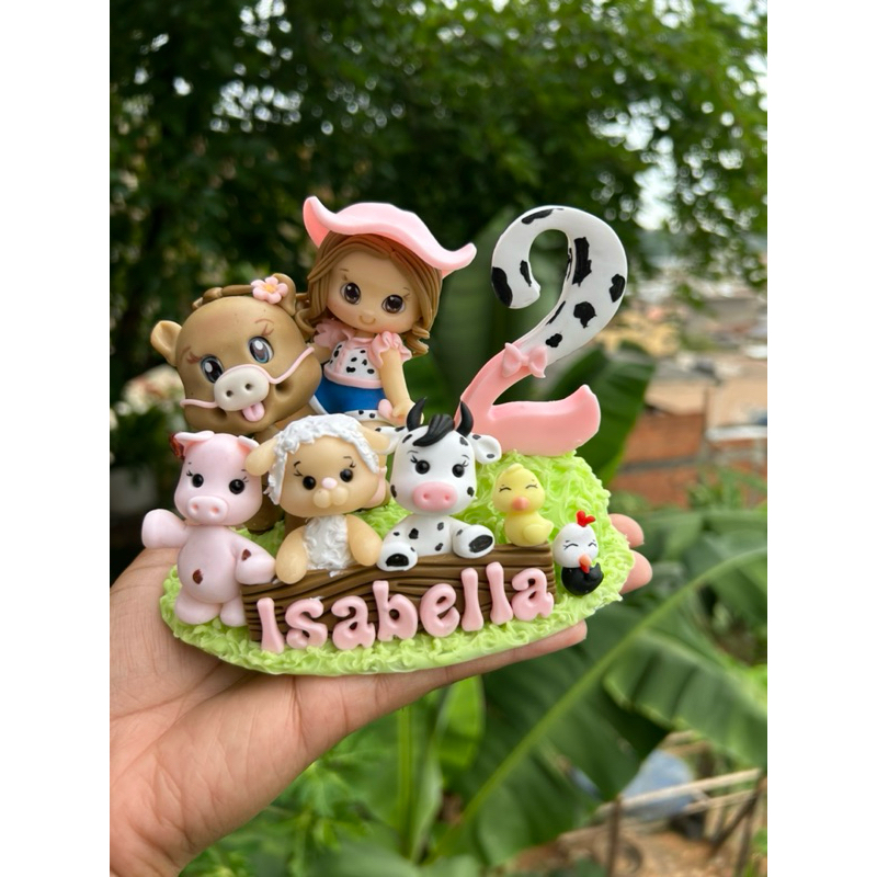 Vela Aniversário Infantil Personalizada Topo de Bolo Biscuit Fazendinha Rosa Bicharada