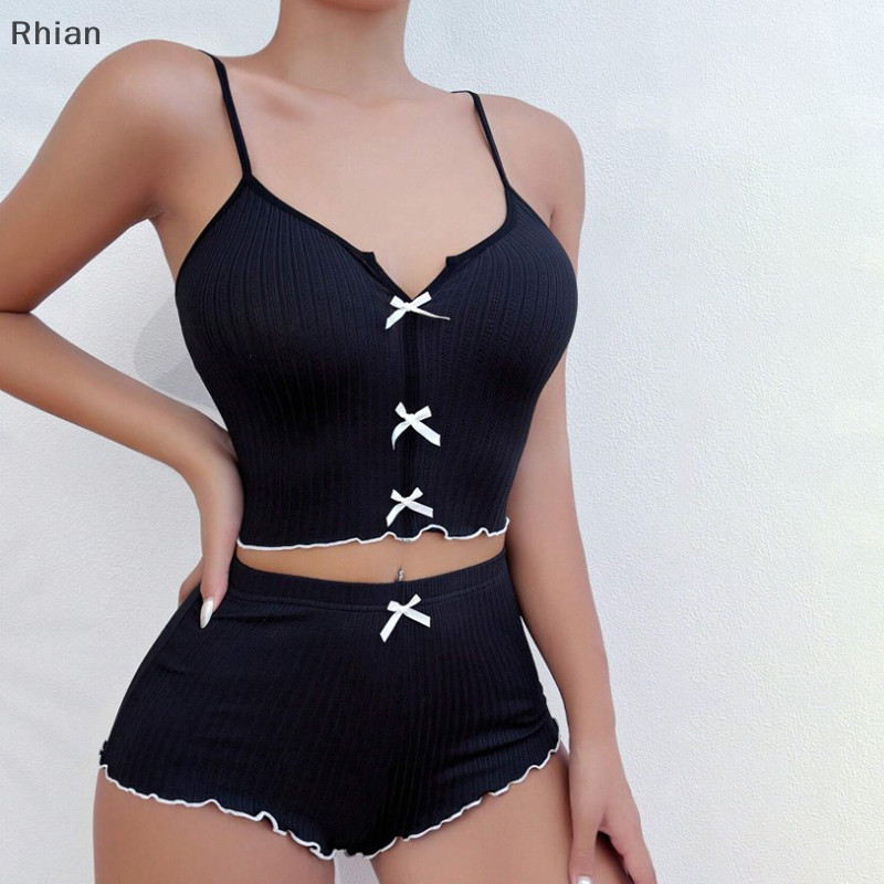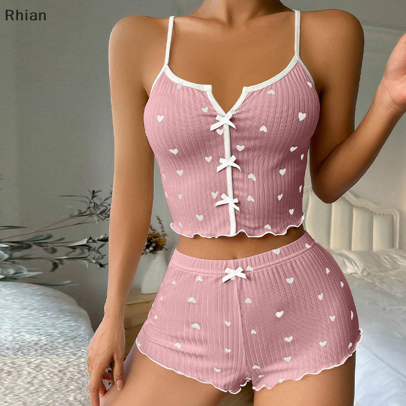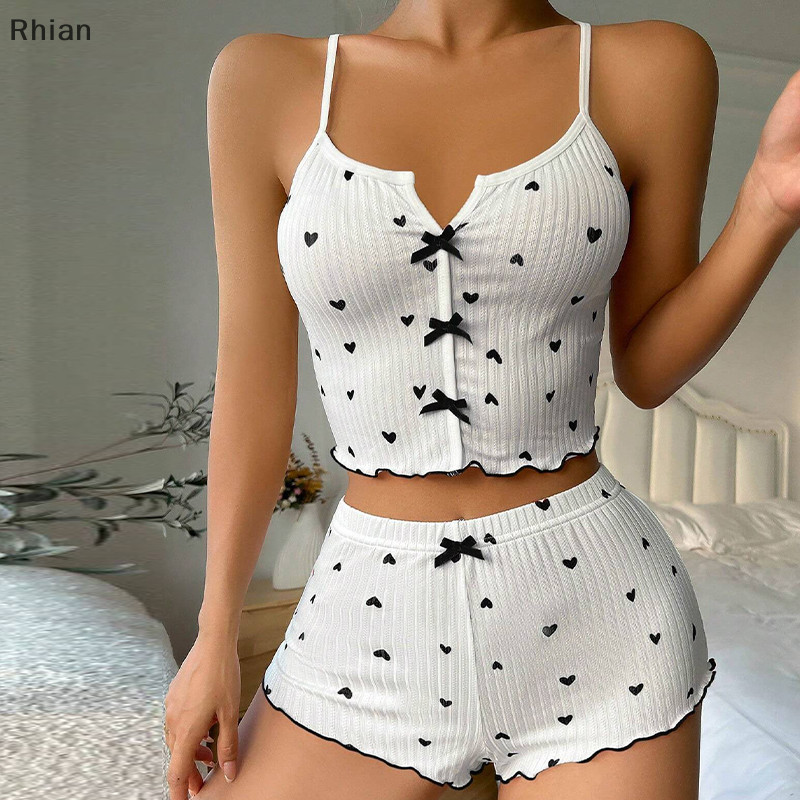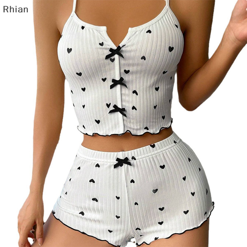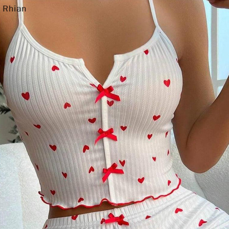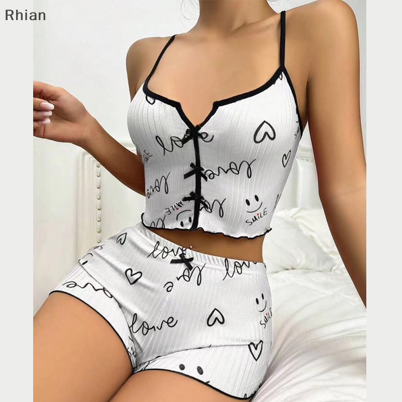 [Rhian] Moda E Sexy Home Casual Love Colete Impresso + Conjunto De Pijamas Curtos Para Mulheres COD