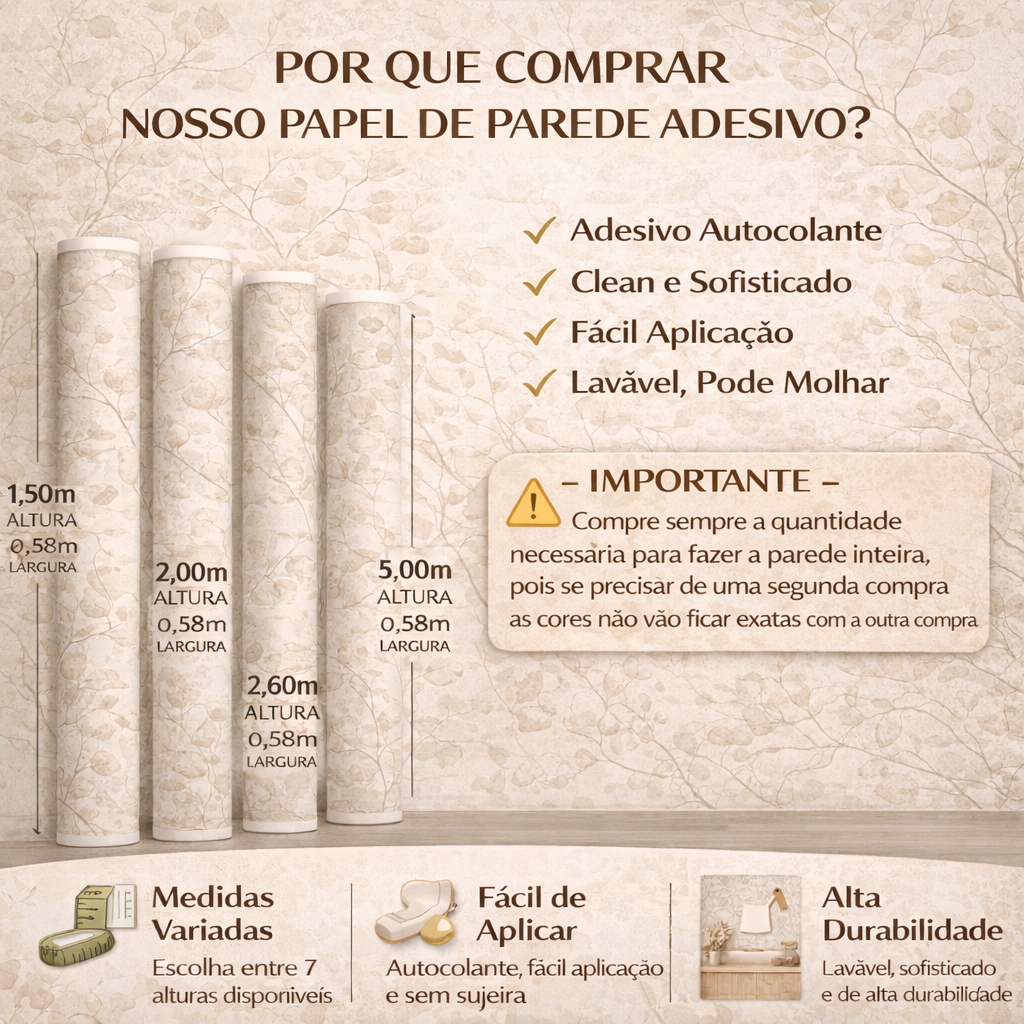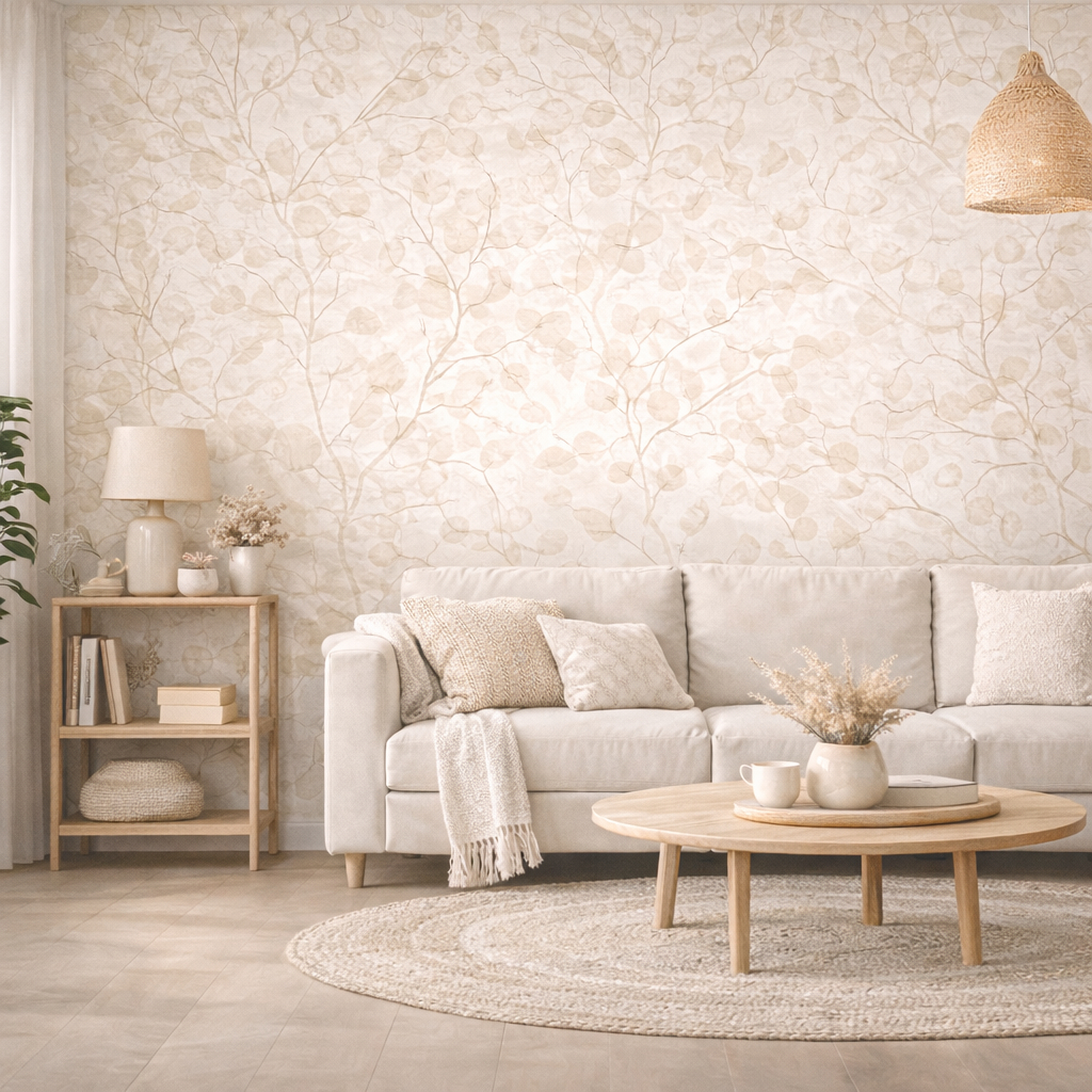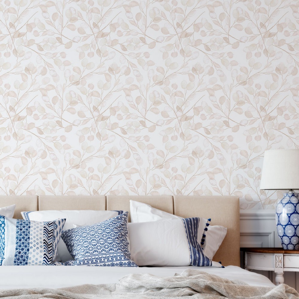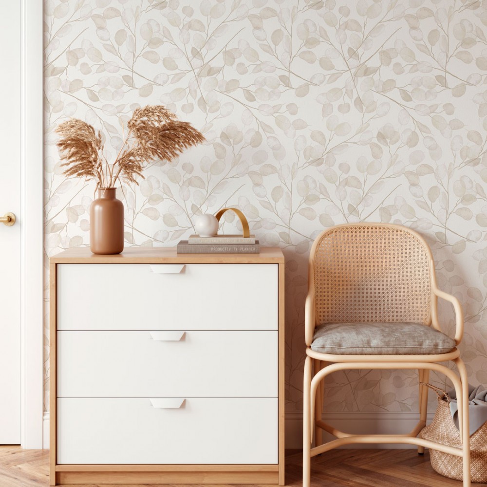 Papel de Parede Adesivo Galhos Folhas Bege Refinado Decoração Clean Vinil Autocolante Lavável Sala Quarto Banheiro Fosco