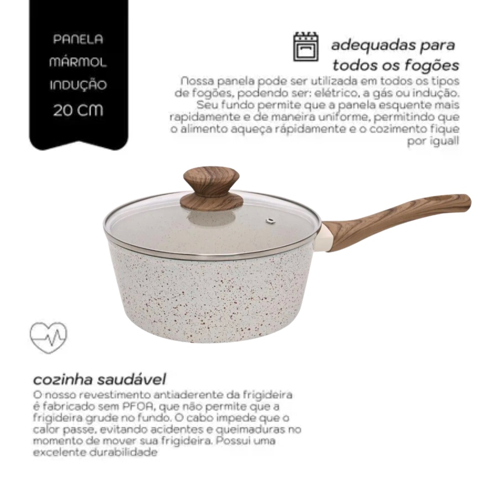 Panela Antiaderente Cerâmica 20cm Cooktop Fogão Indução Avulsa 2,25 Litros Marmol MimoStyle