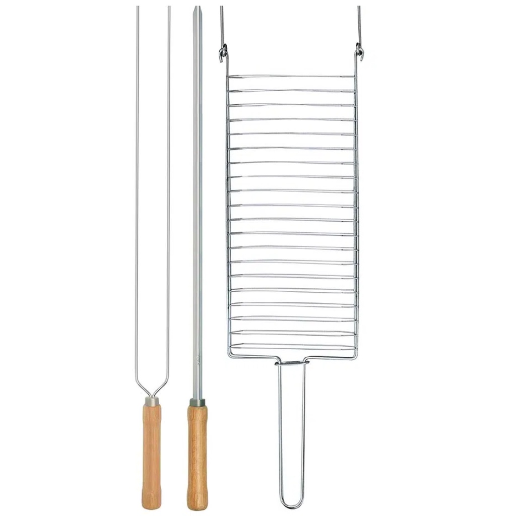 Kit Preparo Churrasco 4pcs Churrasqueira Grelha e Espetos 55cm Simples e Duplo Cabo Madeira