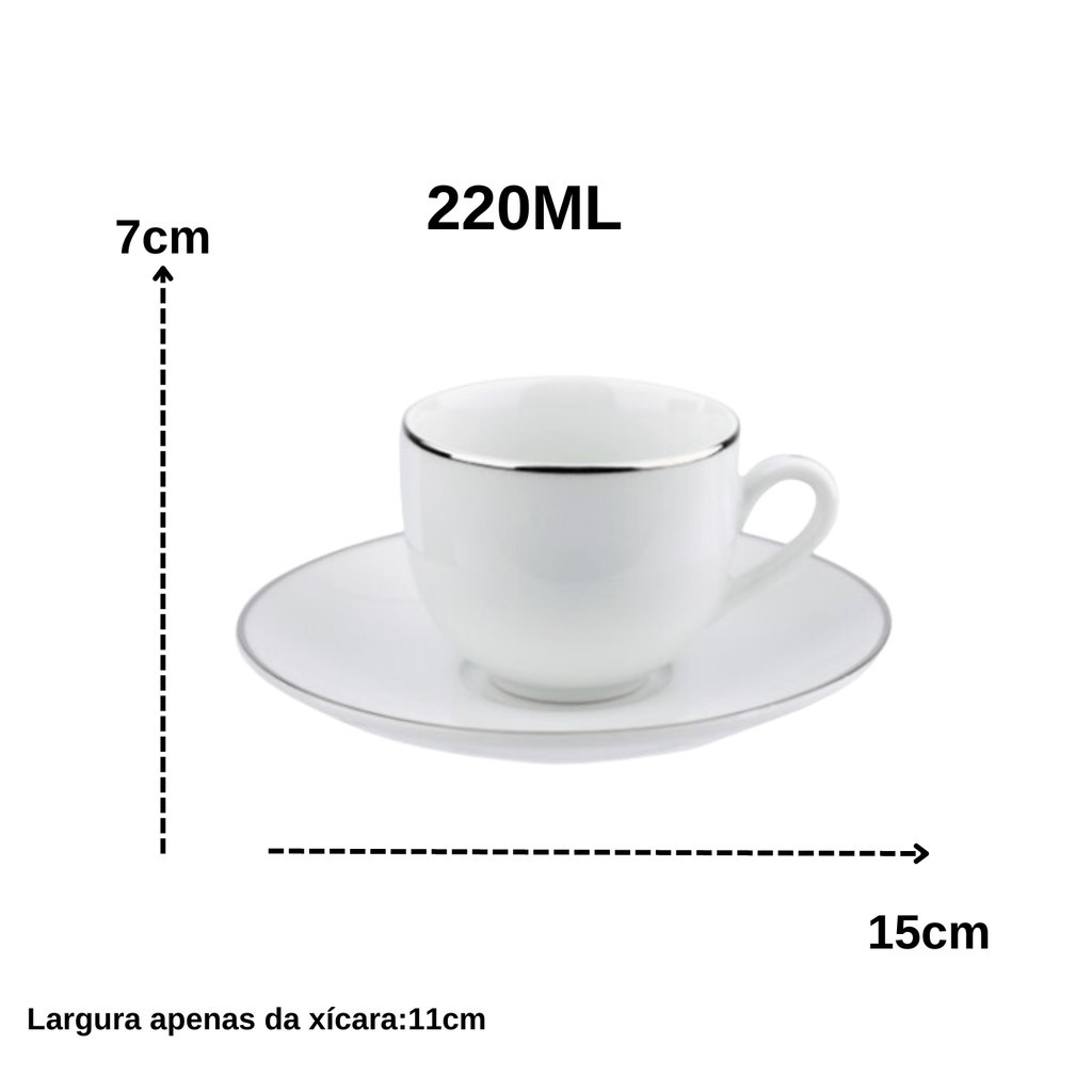Jogo Xicaras De Chá Café Com Pires 220ml Porcelana Kit 6 Peças Borda Prata Luxo Legacy Silver