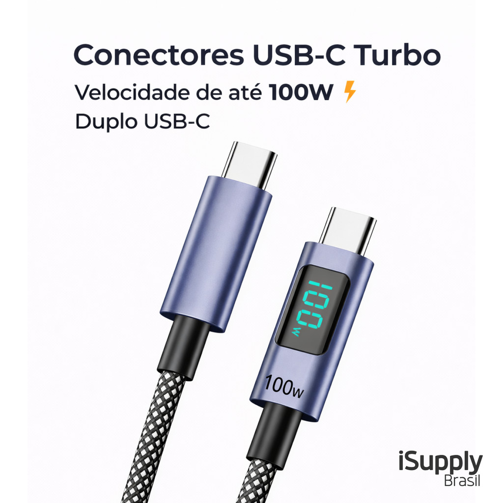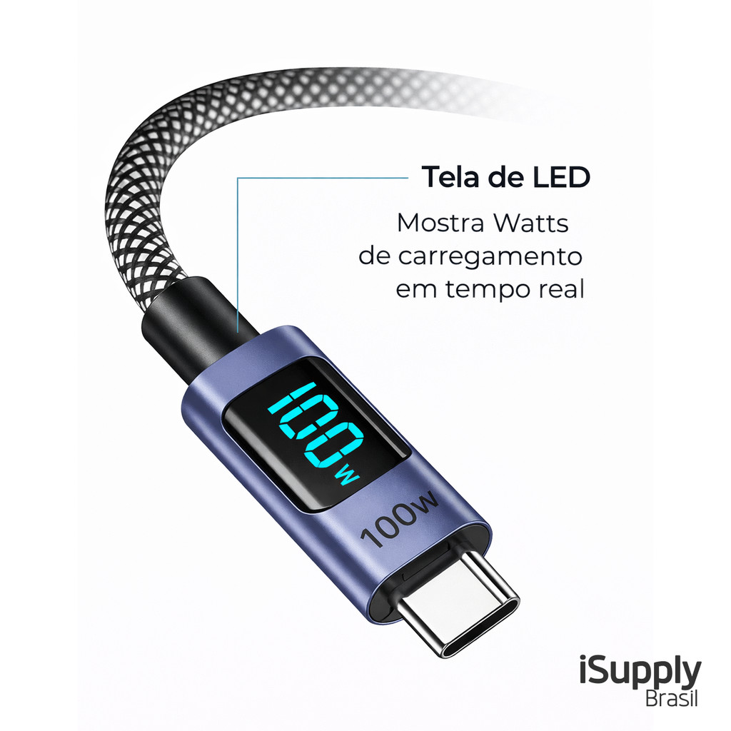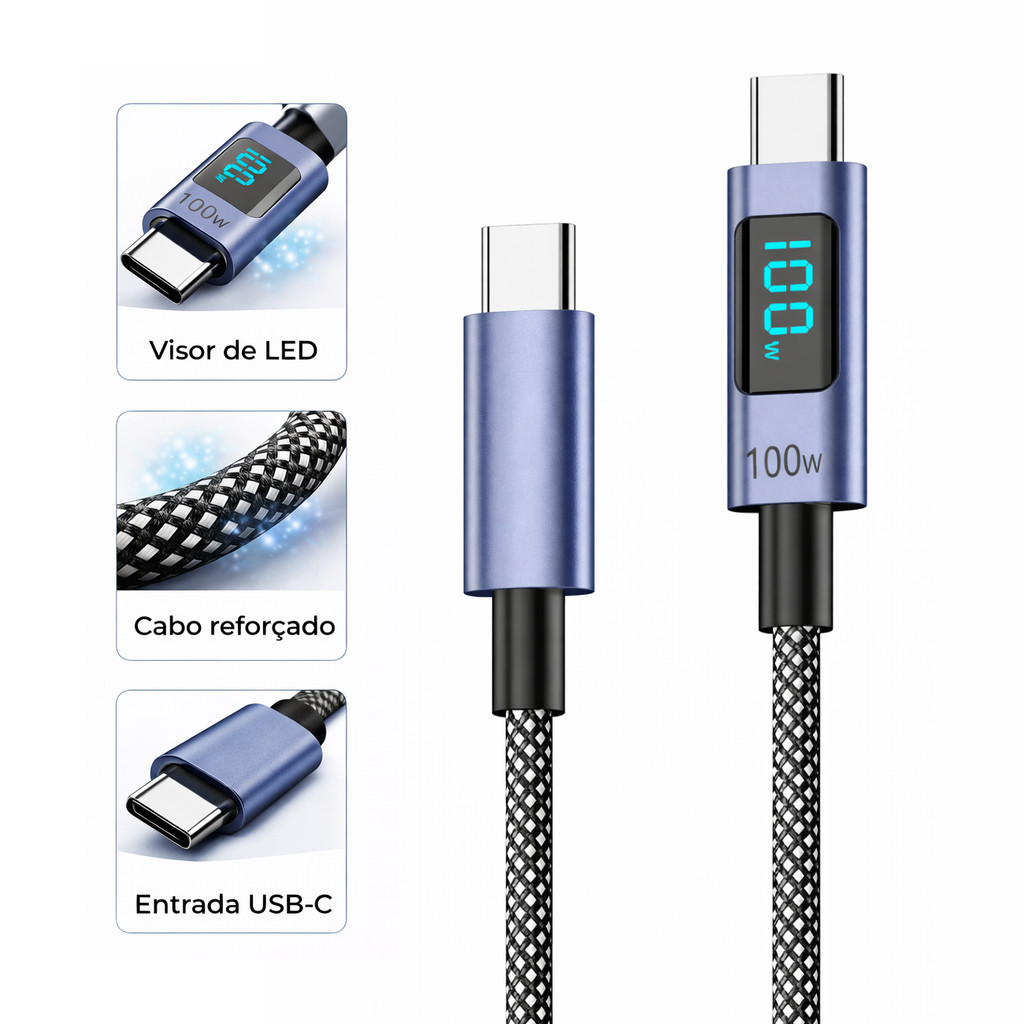 Cabo Tipo C 100W Com Tela LED Mostra Potência Wats Turbo PD Carga Rápida