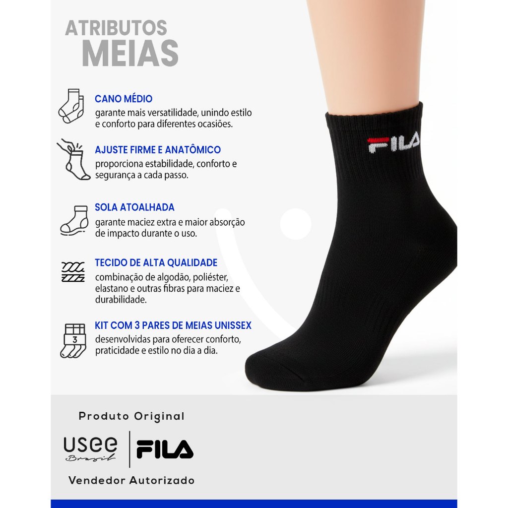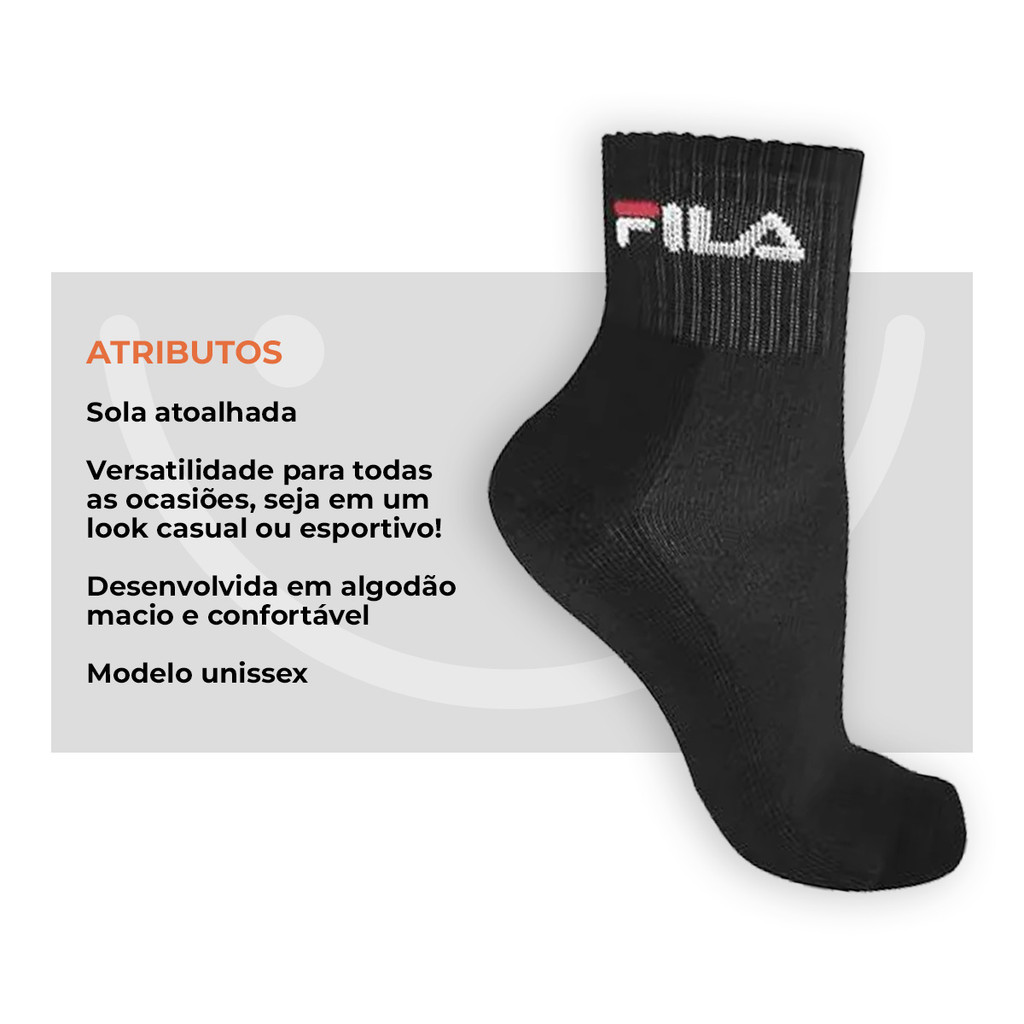 Kit com 6 Pares de Meias Cano Médio Algodão Unissex Original Fila