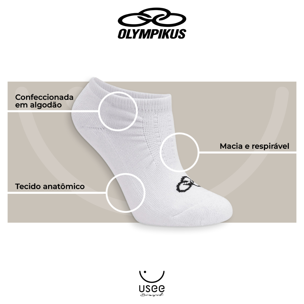 Kit com 6 Pares de Meias Invisível Adulto Algodão Macio Original Olympikus