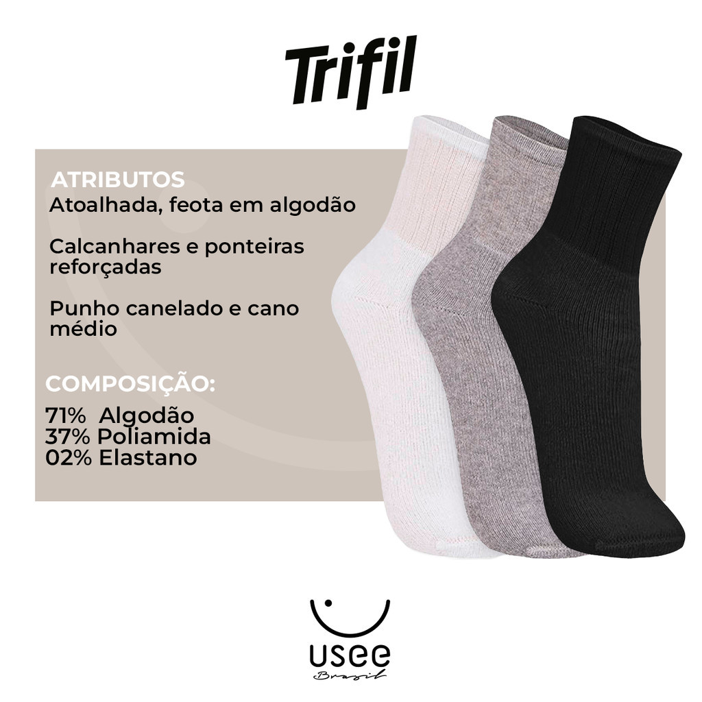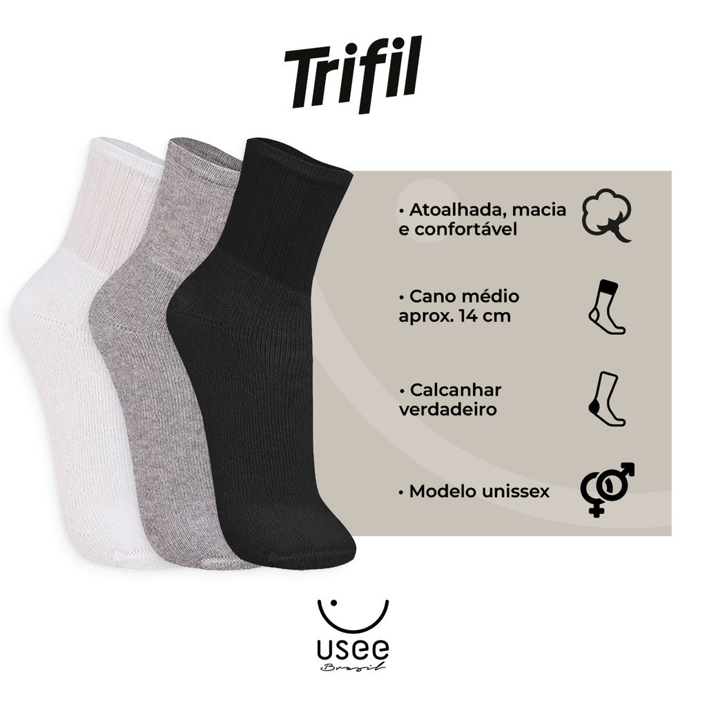 Kit com 12 Pares de Meias Cano Médio Esportiva Atoalhada Trifil