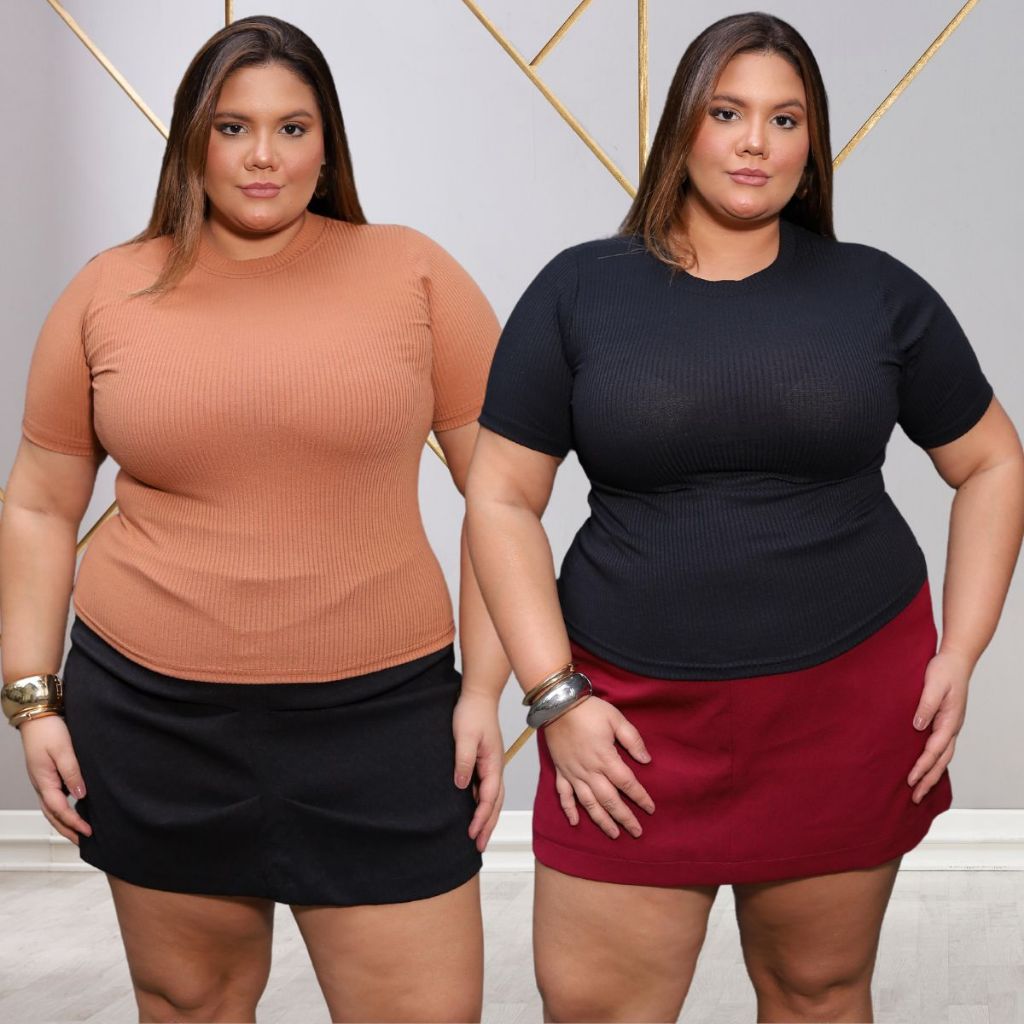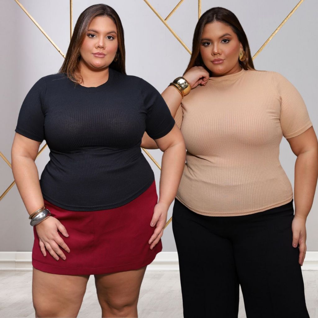 Kit 2 Blusas Caneladinho Premium Plus Size Feminina Gola Alta Veste 44 ao 52 Estilosa Malha Elegante