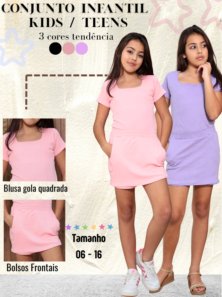 Conjunto Infantil Juvenil Teen Menina Short Saia e Blusa Verão veste 06 ao16 Anos Passeio Moda Blogueira Presente Ribana