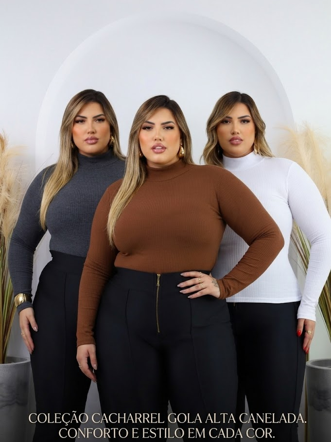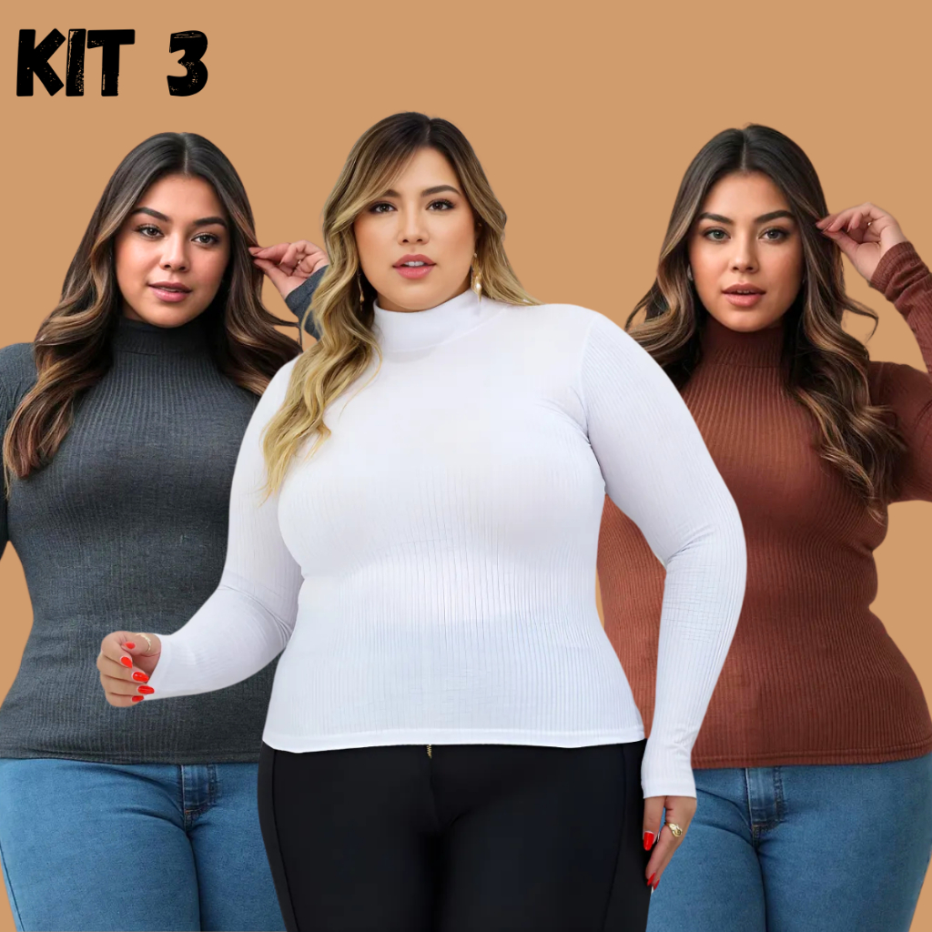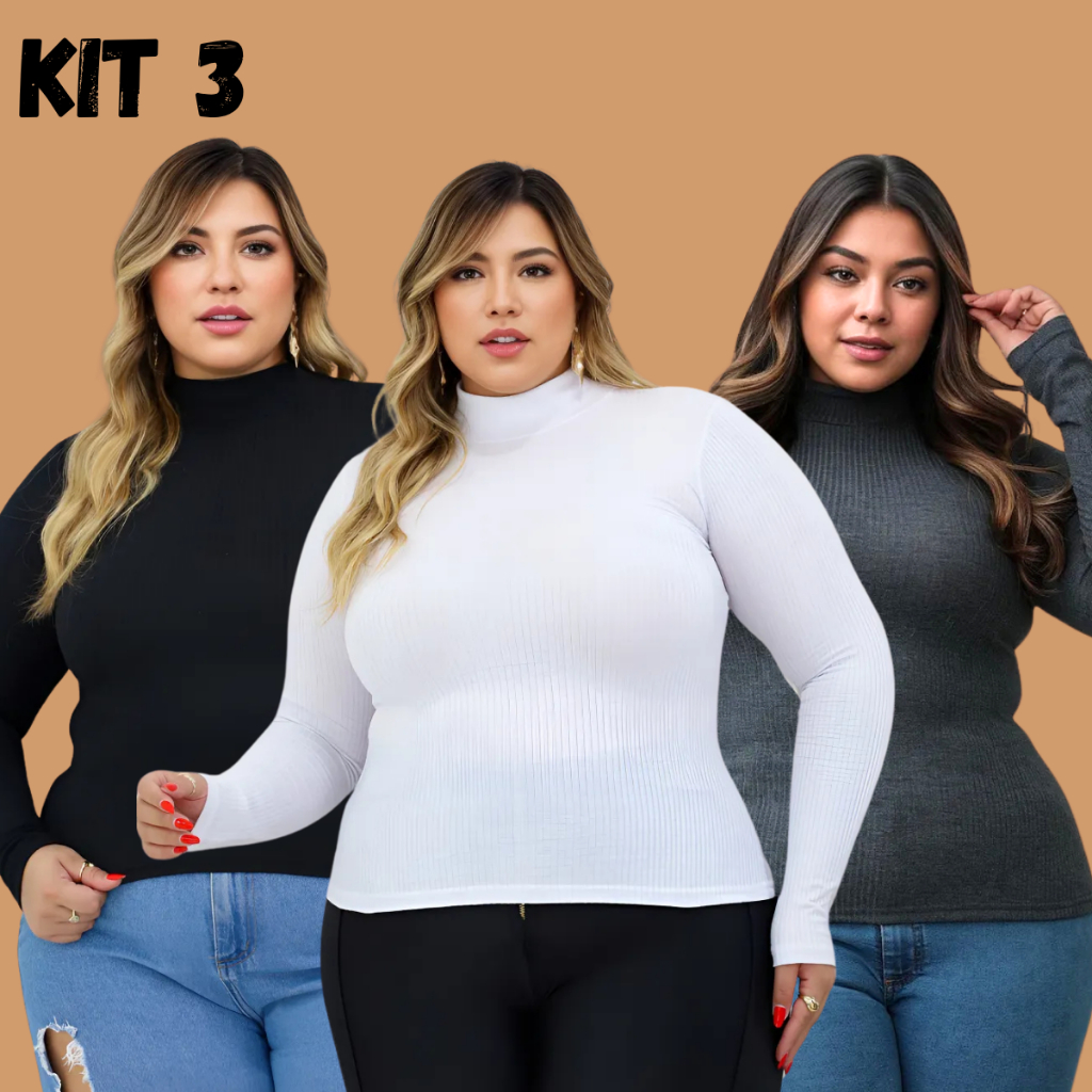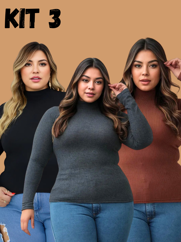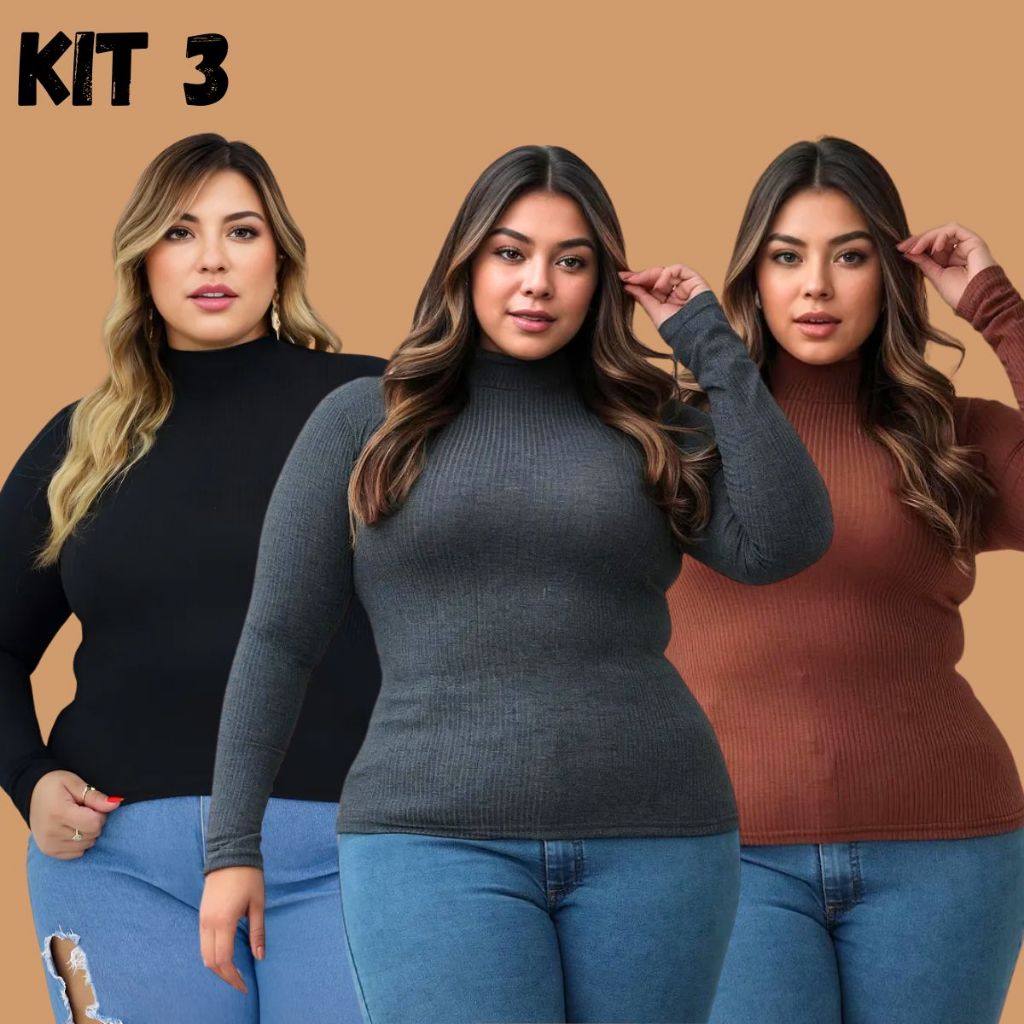 Kit 3 Blusas Cacharrel Canelada de Inverno Feminina Plus Size Elegante Grossa de Frio Curvy Curve Meia estação