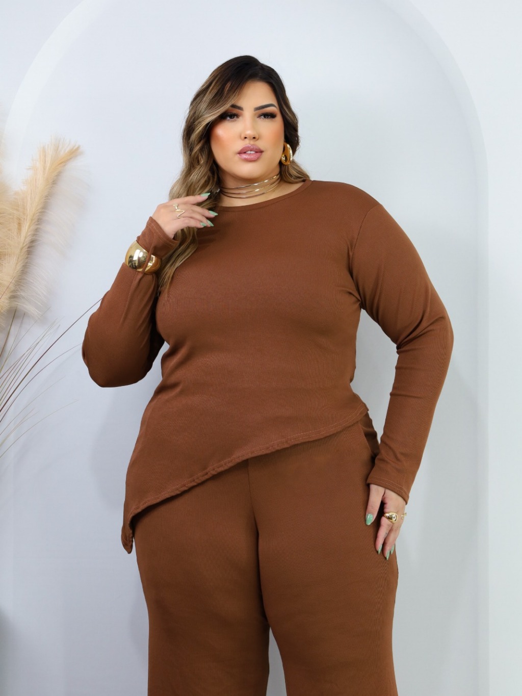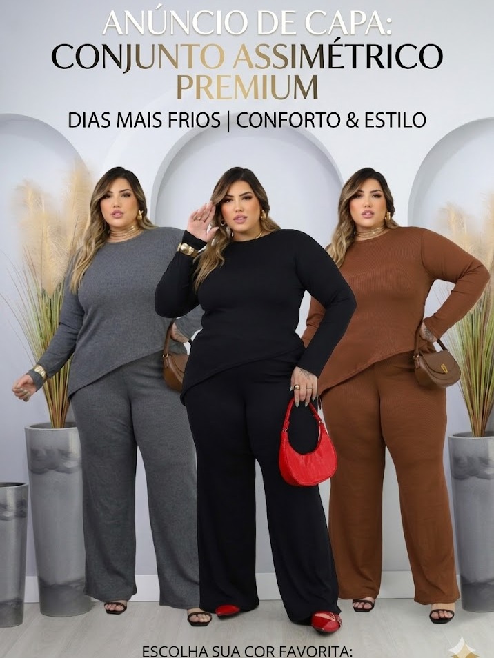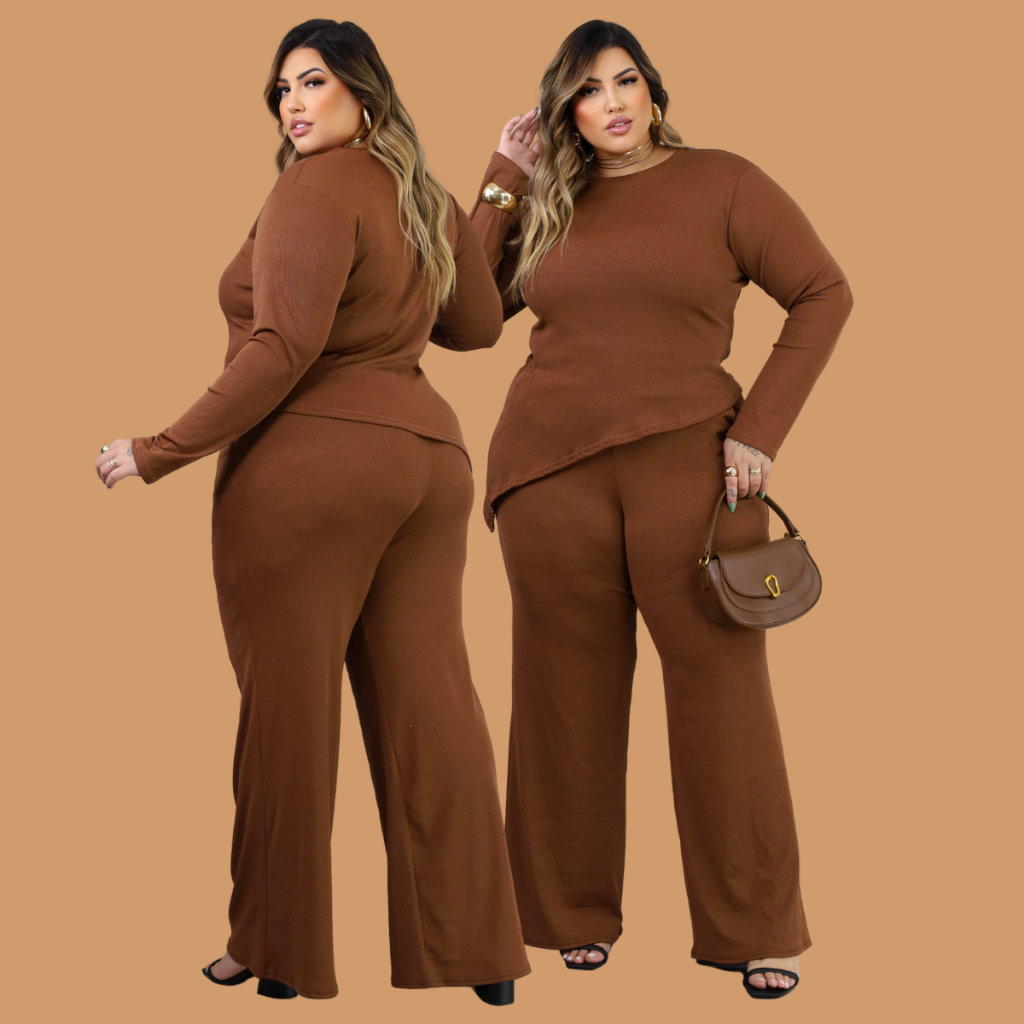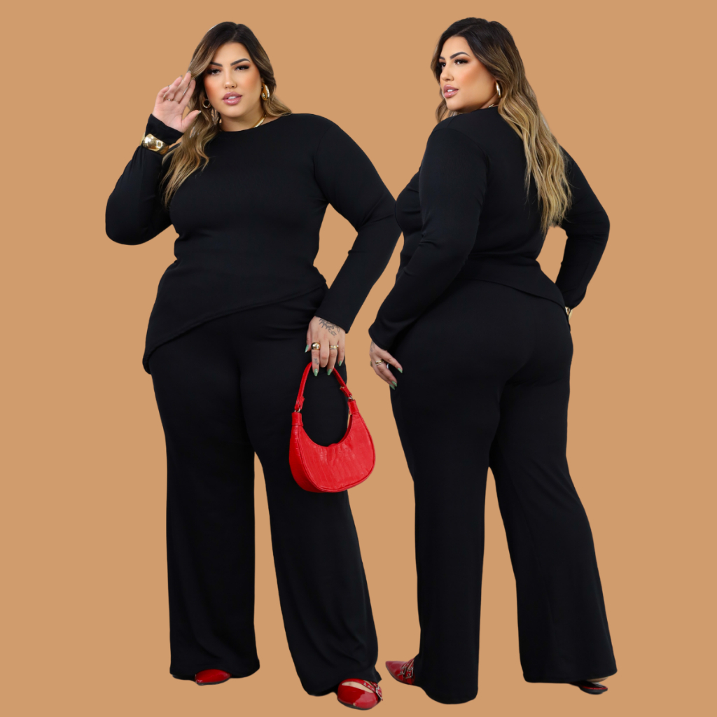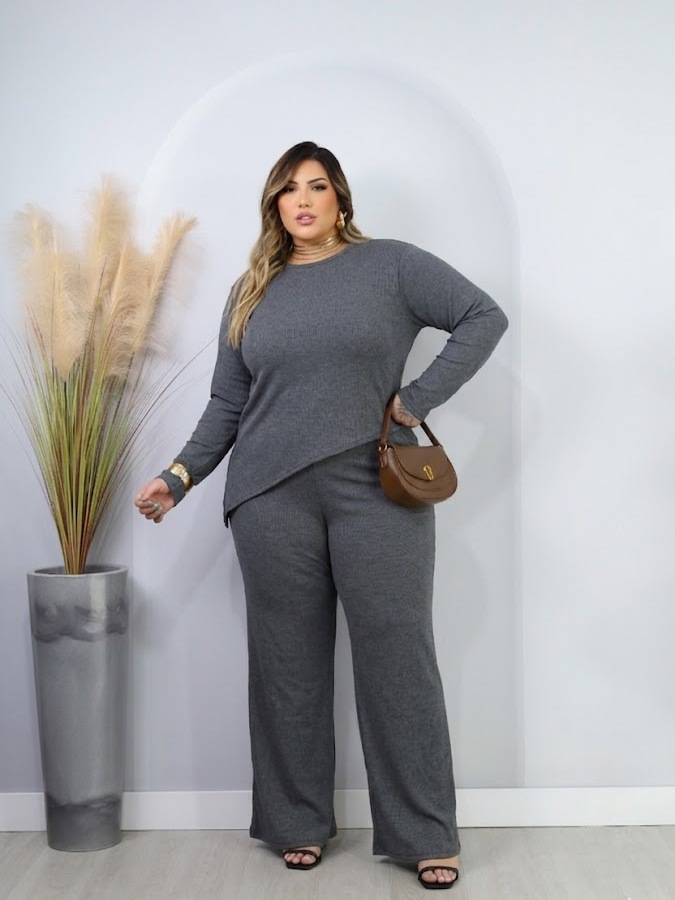 Conjunto Plus Size de frio inverno Blusa Manga Longa assímetrica Calça Pantalona Wide Leg 44 ao 52 Meia Estação