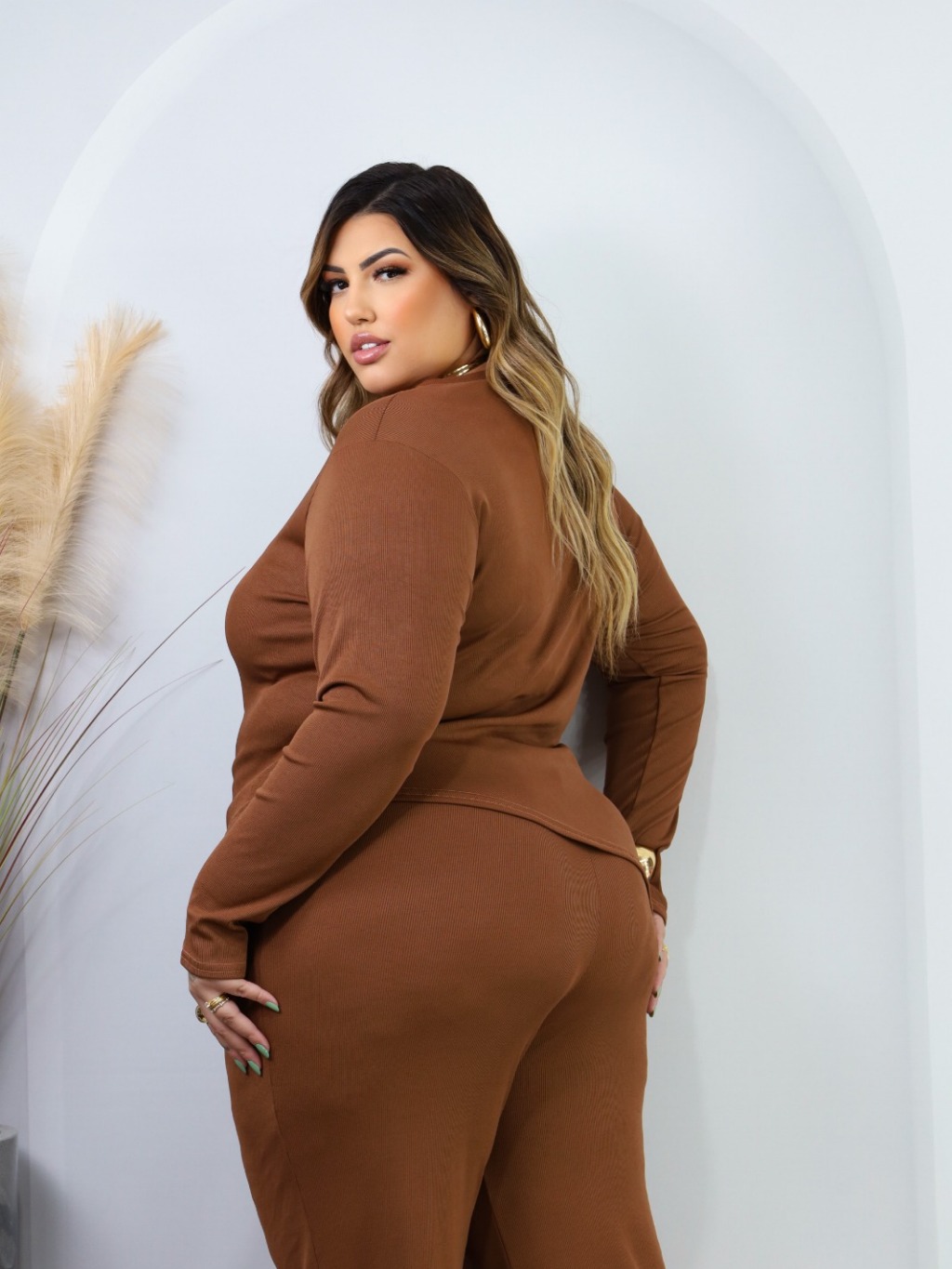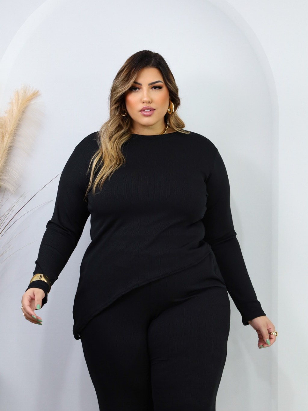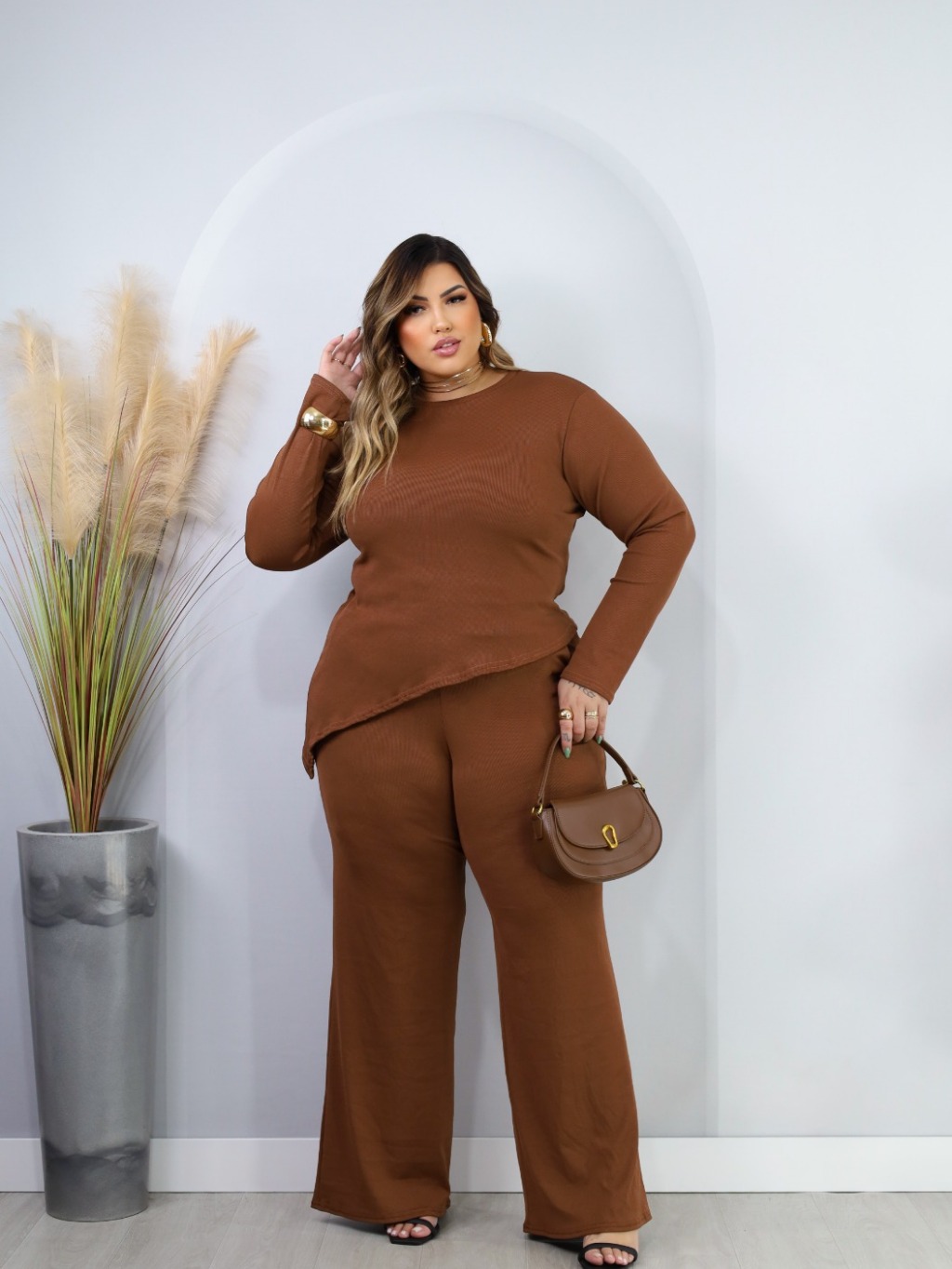 Conjunto Plus Size de frio inverno Blusa Manga Longa assímetrica Calça Pantalona Wide Leg 44 ao 52 Meia Estação