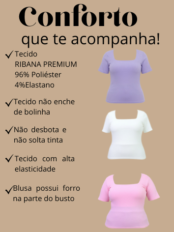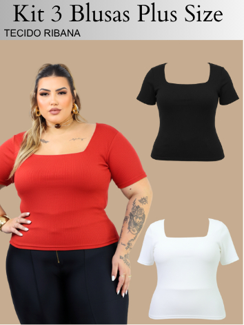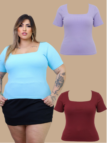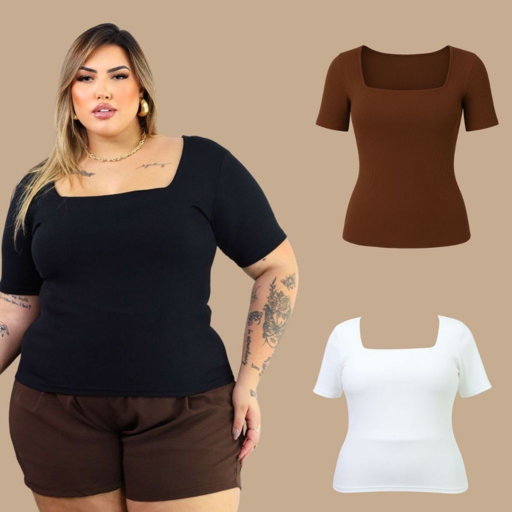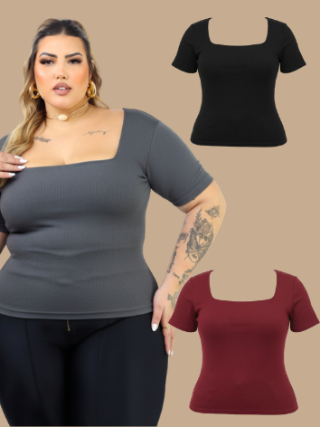 Kit 3 Blusas Plus Size Gola Quadrada Feminina Verão Basica casual elegante ALTA ELASTICIDADADE curve