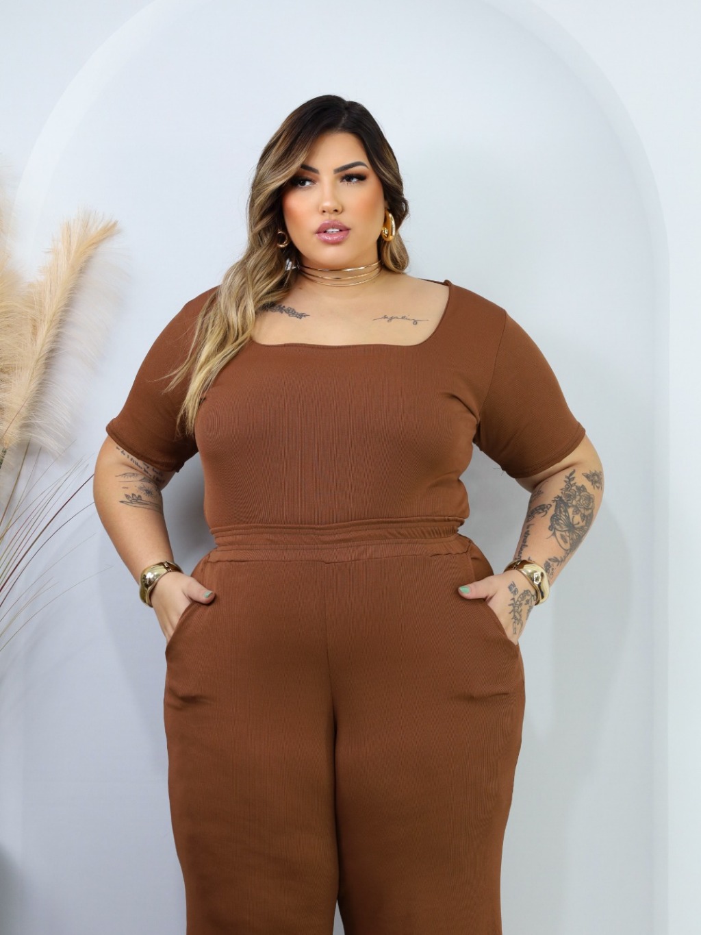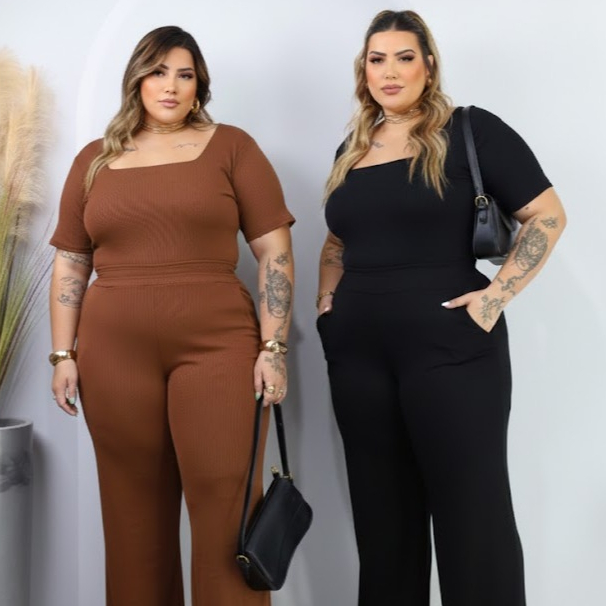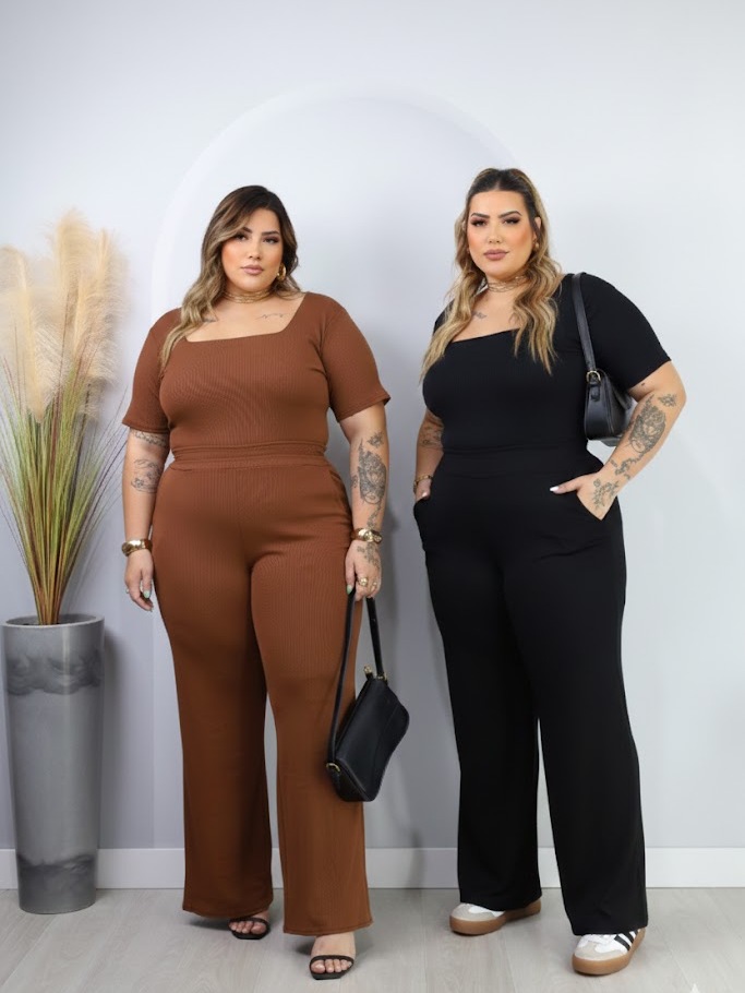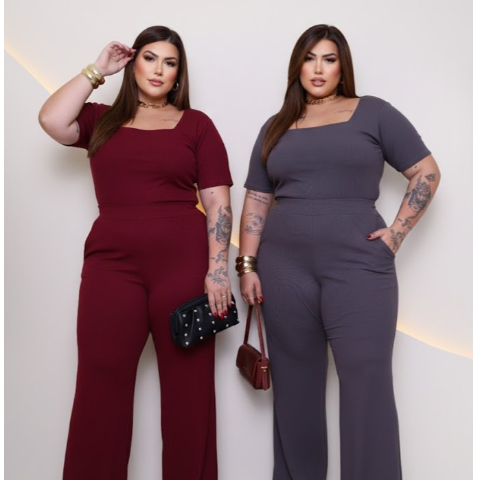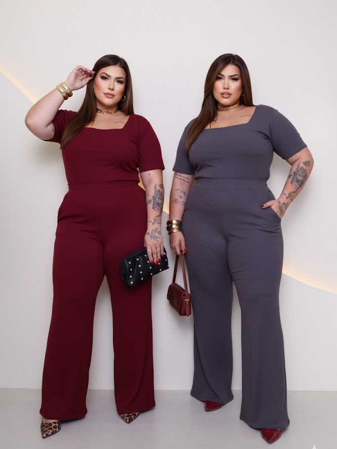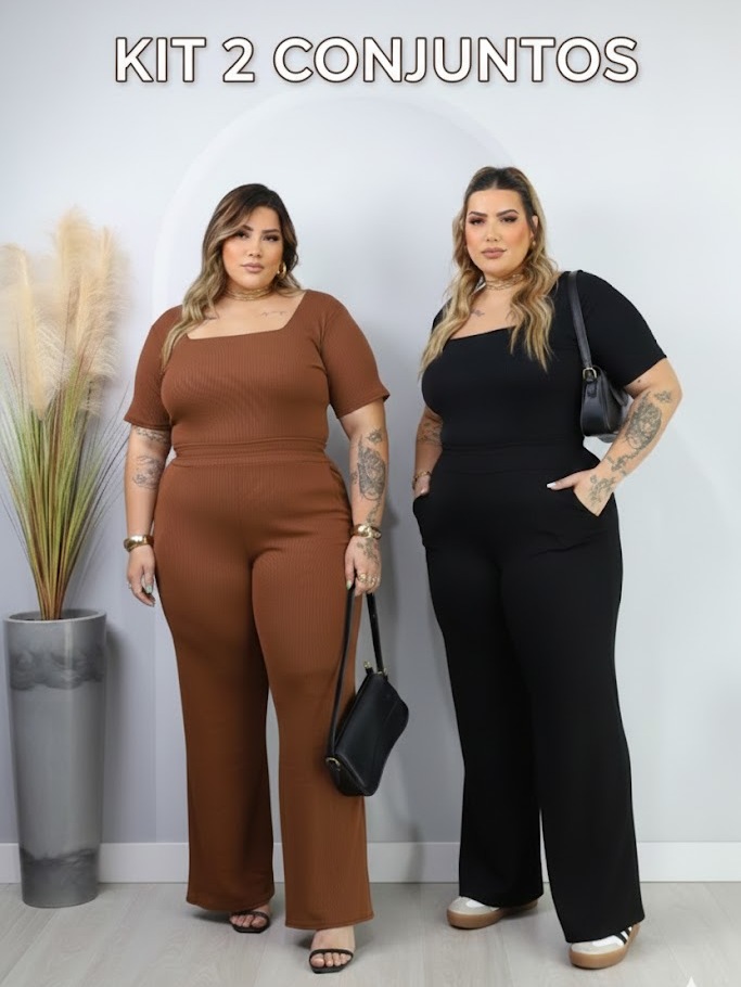 Kit 2 Conjuntos Plus Size Pantalona Com Bolso E Blusa Gola Quadrada Ribana Premium confortável curve
