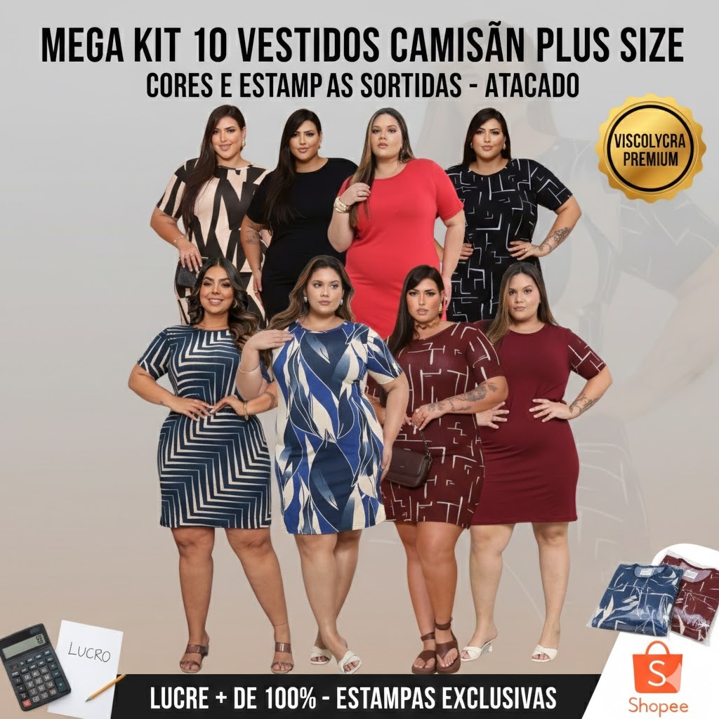 Kit 10 Vestidos Camisão Plus Size Atacado Camisetão Feminino Vestidinho Soltinho Confortável Tamanhos G1 ao G3
