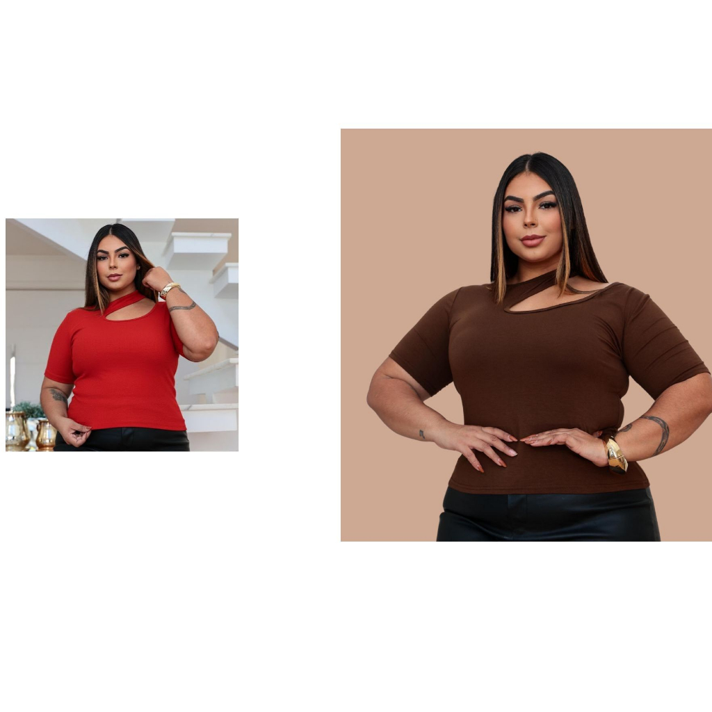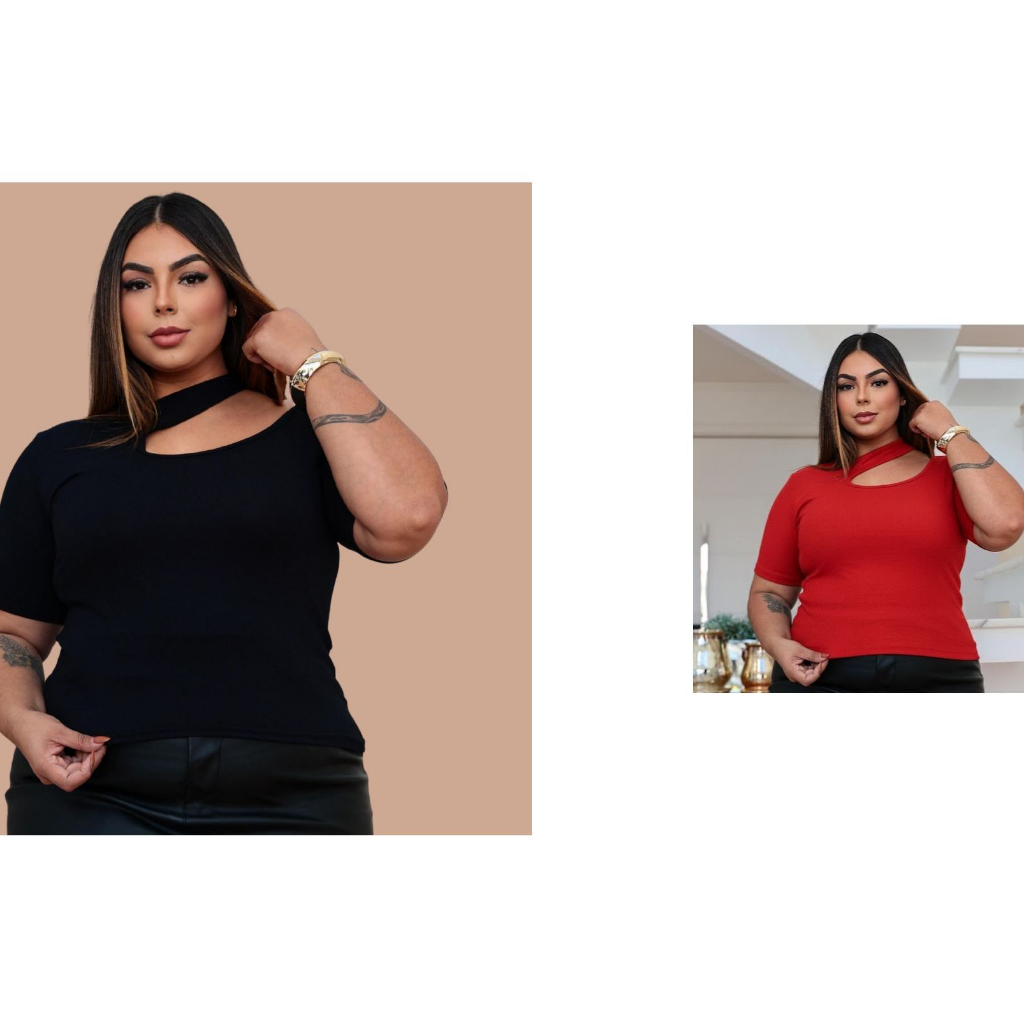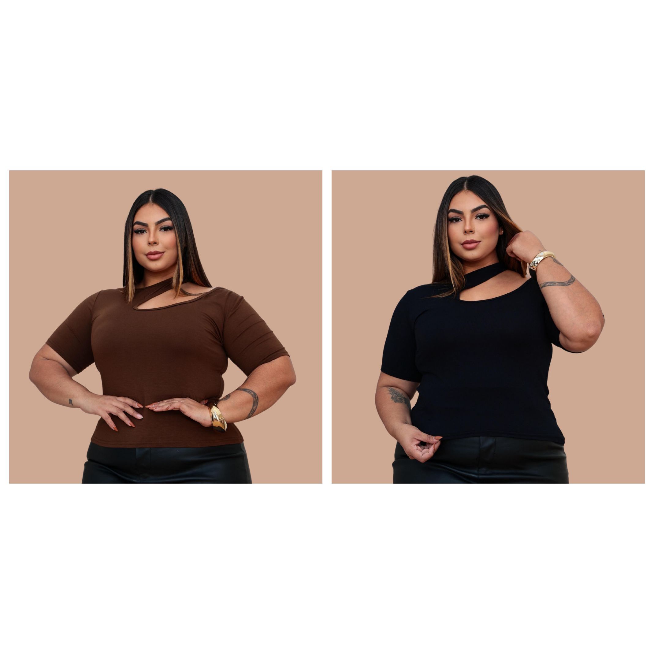 Kit 2 Blusas Femininas Chocker Manga Curta Plus Size Malha Confortável Tamanho G1