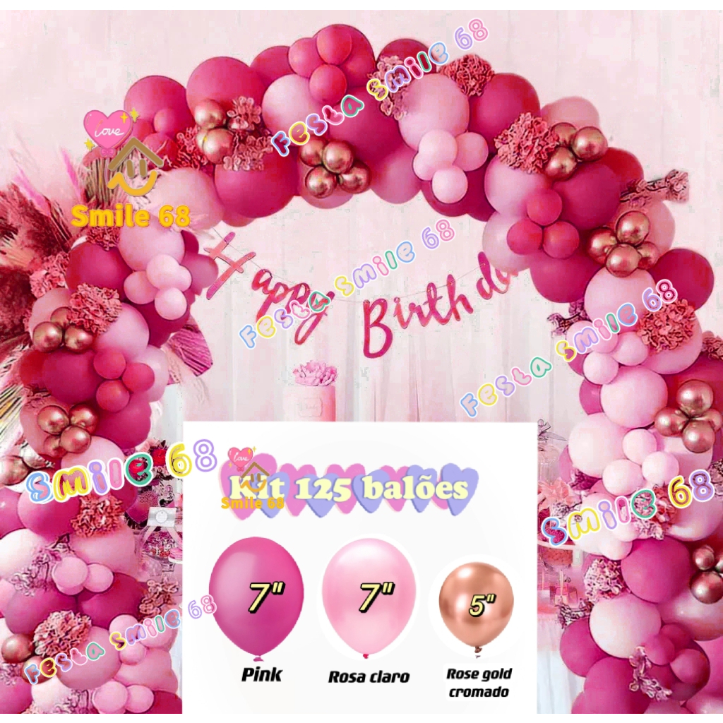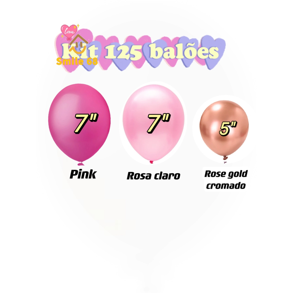 (Kit 125 unidades) Balões Bexiga Pink Rosa Claro liso + Rose gold cromado Para Festa Decoração Aniversário