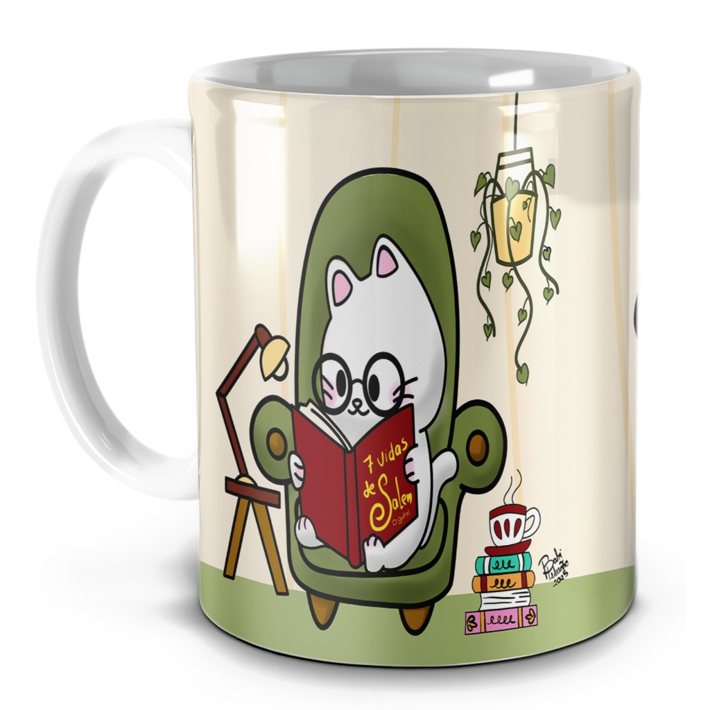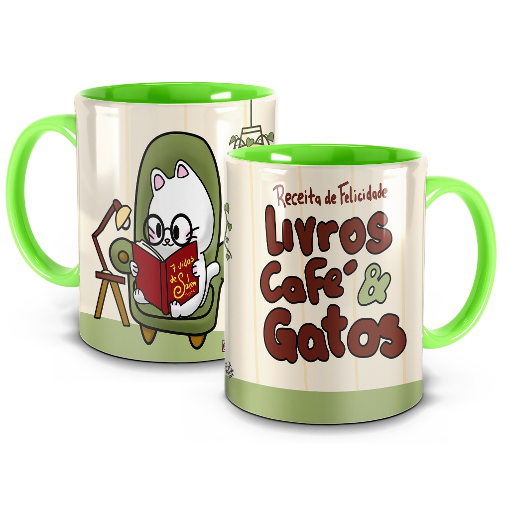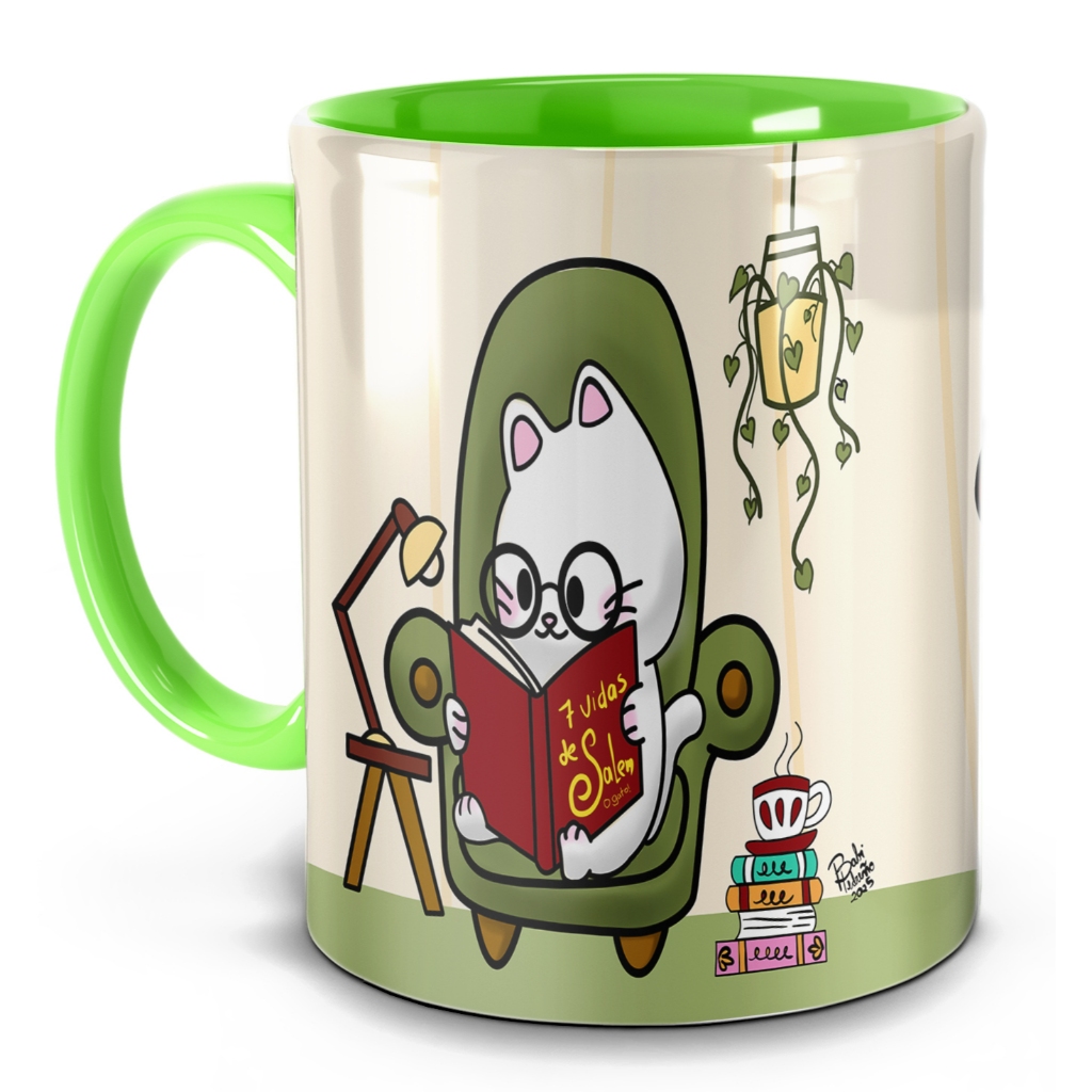 Caneca de Cerâmica Livros, Café e Gatos, Design Gatinho Leitor, Branca e Verde, 325ml