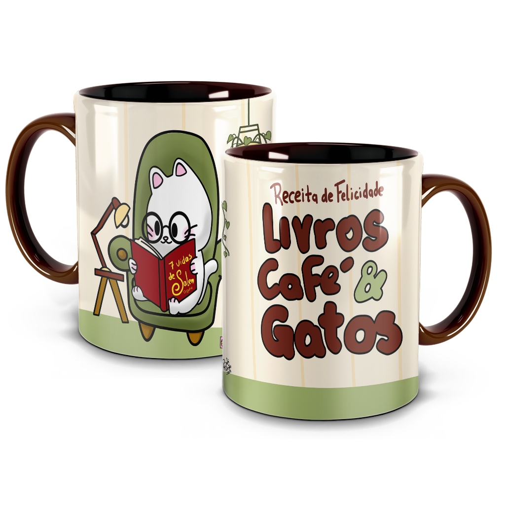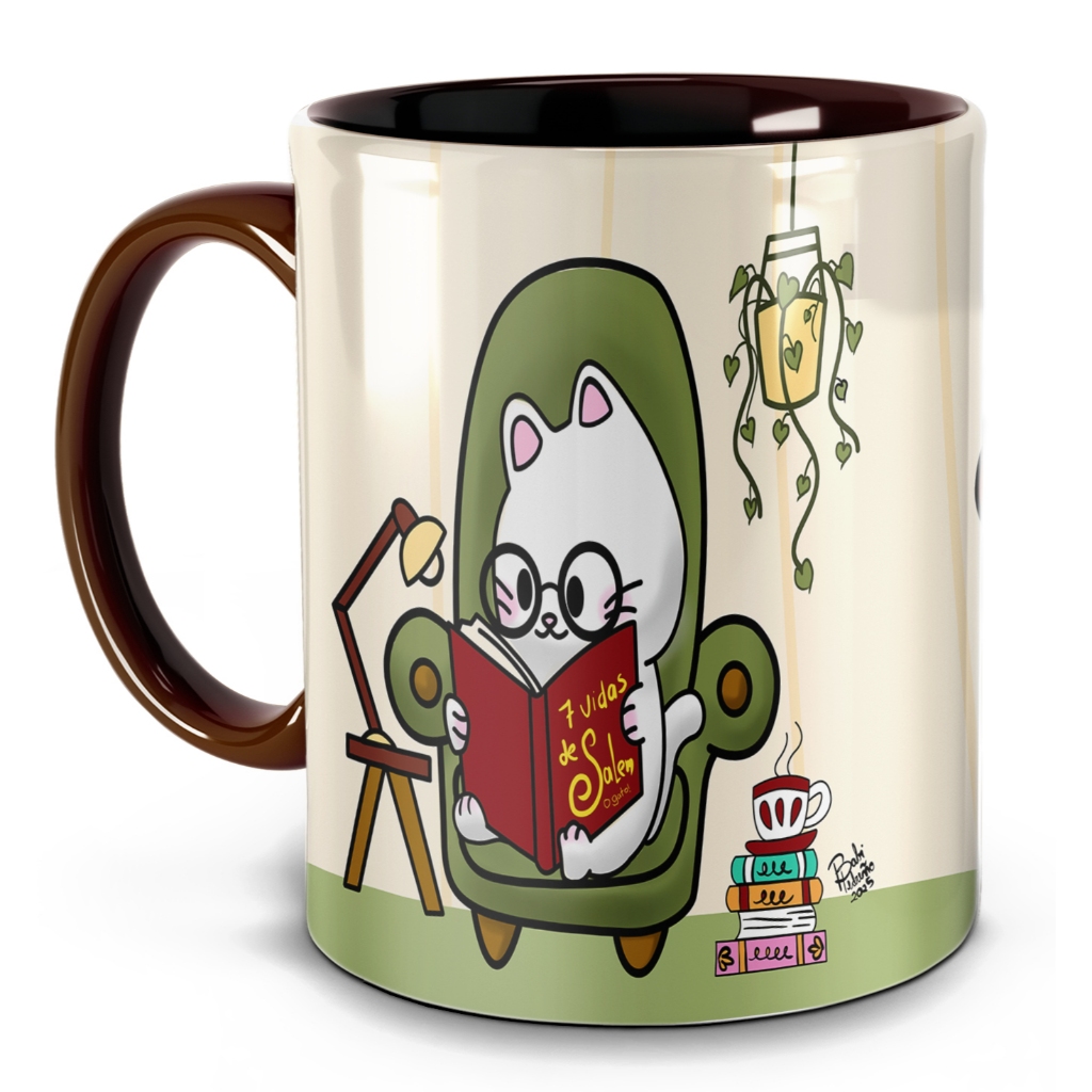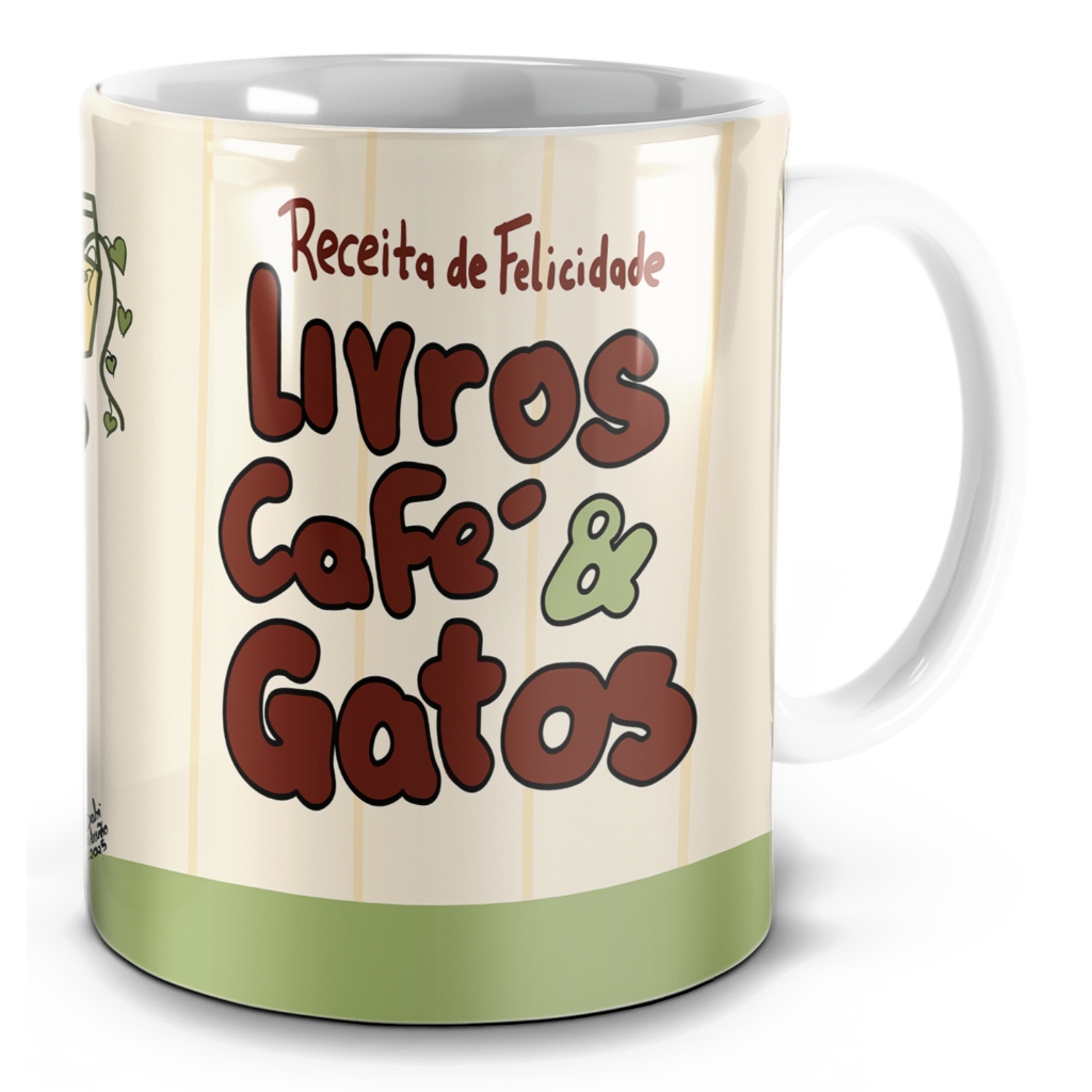 Caneca de Cerâmica Livros, Café e Gatos, Design Gatinho Leitor, Branca e Verde, 325ml