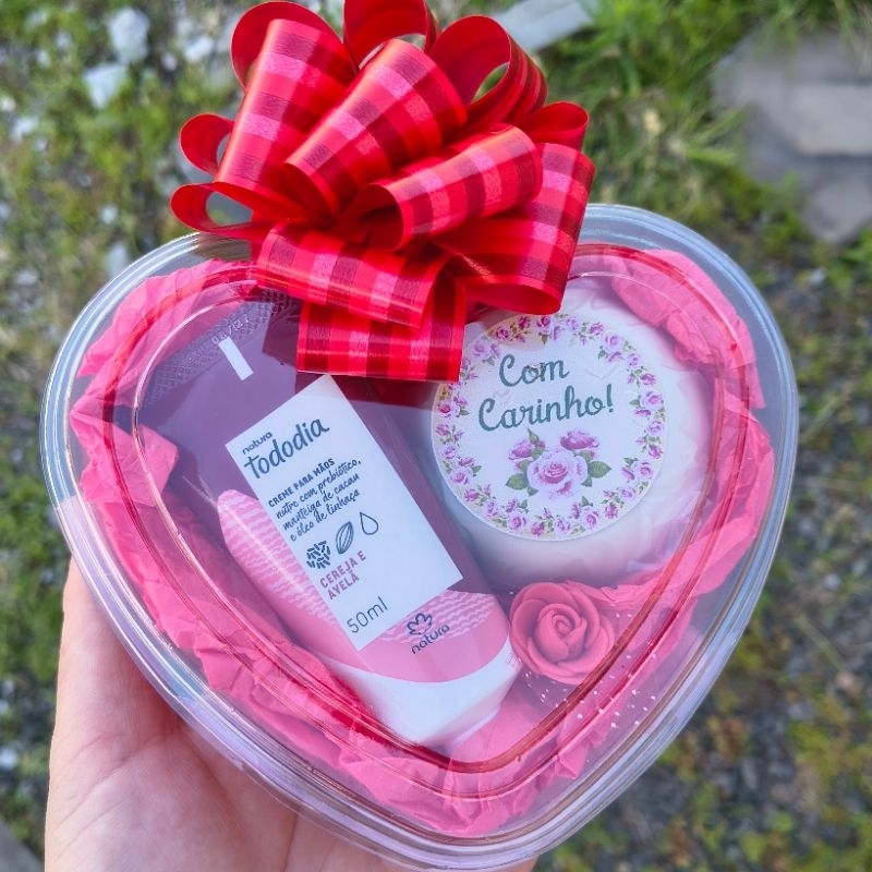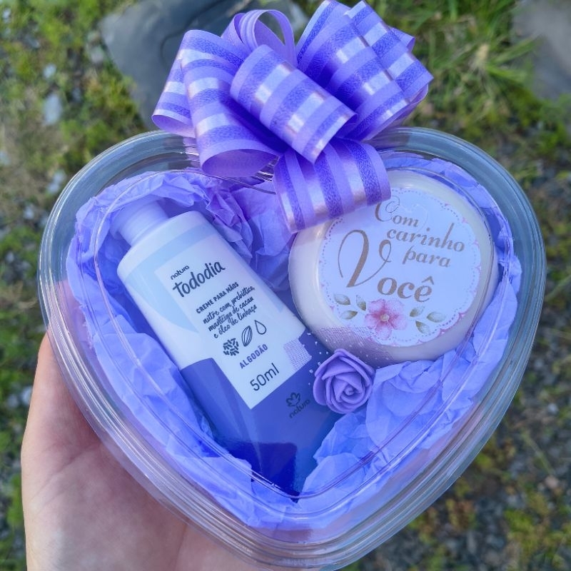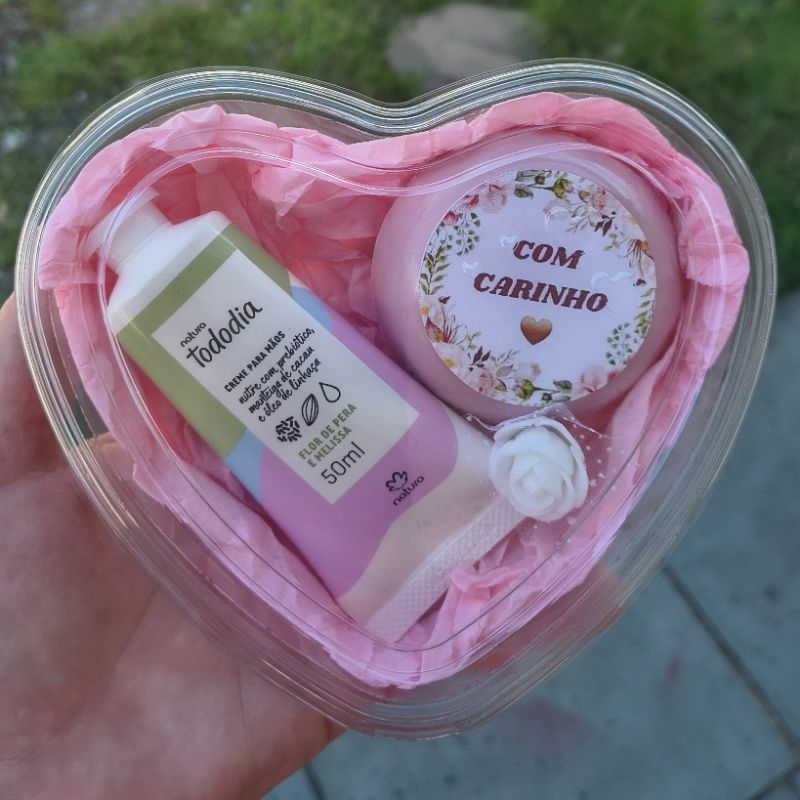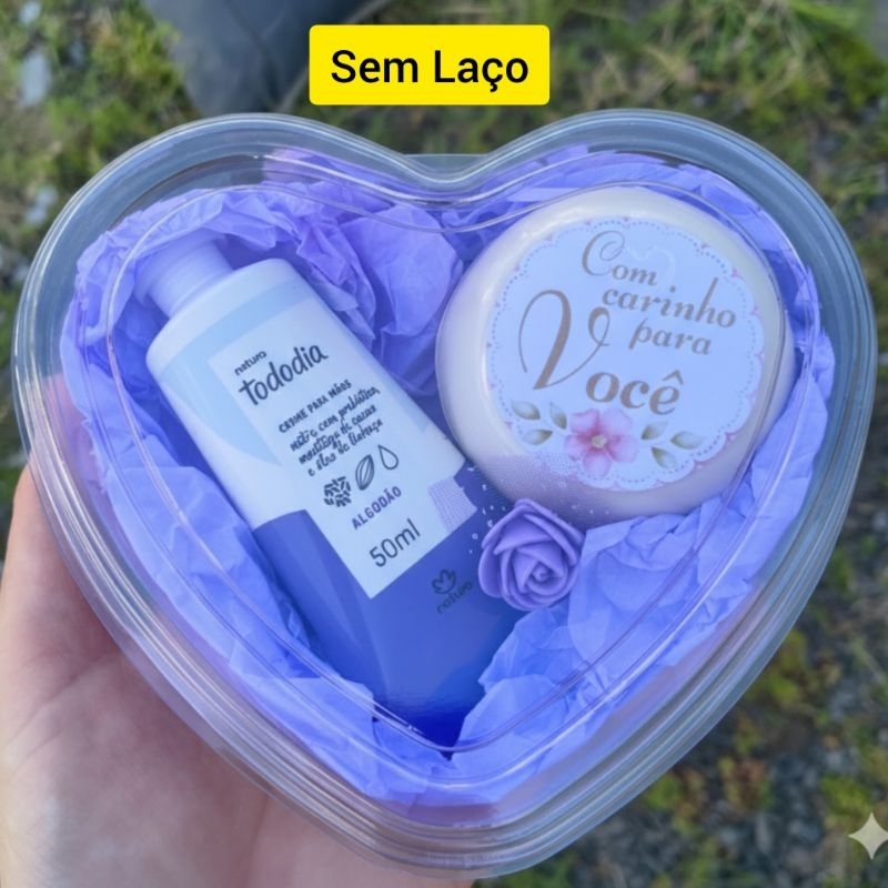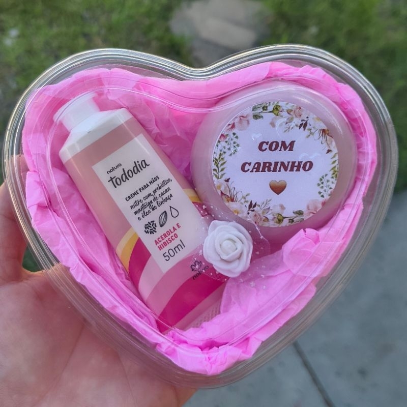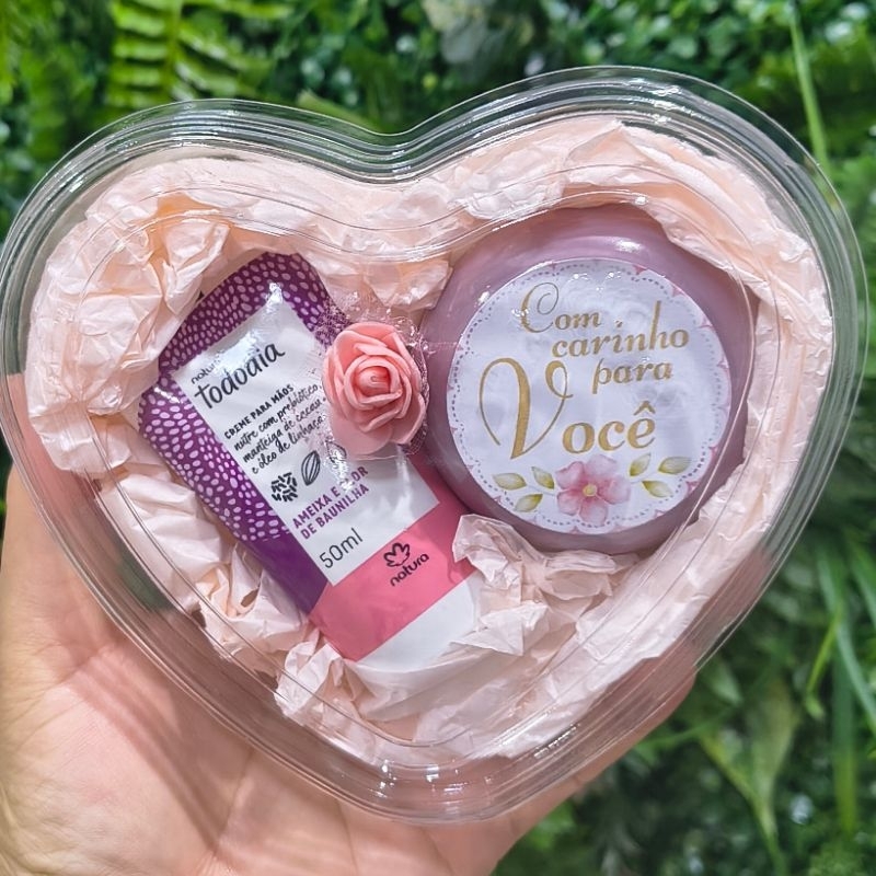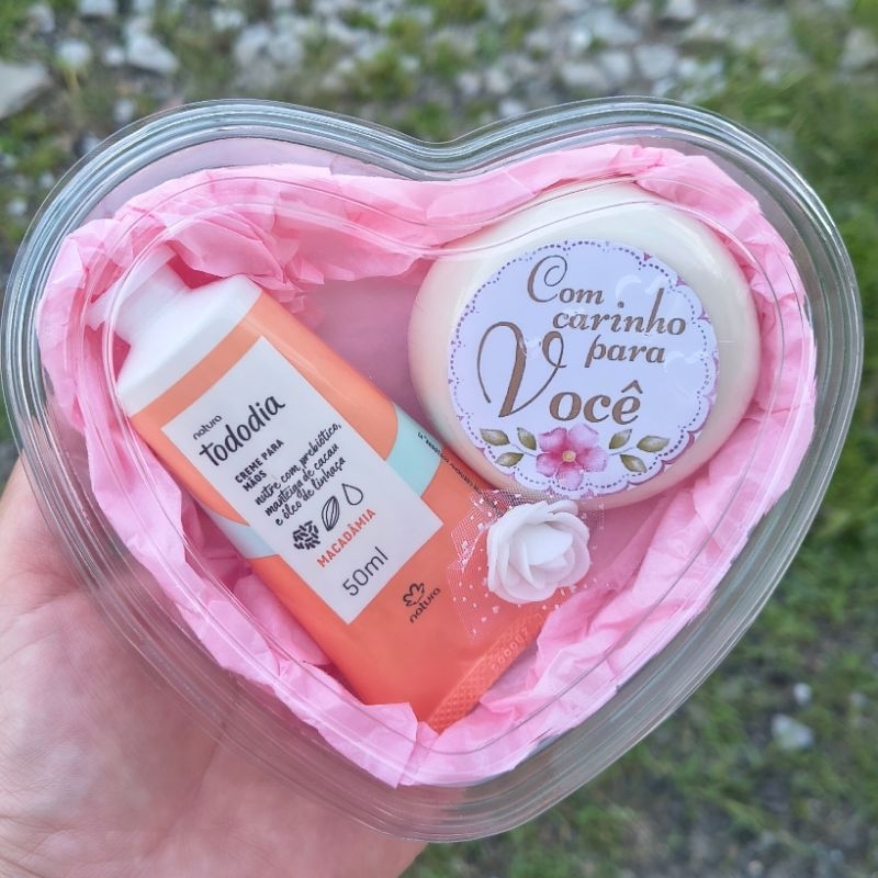 Kit Presente/Lembrancinha Natura Creme para Mãos e Sabonete Tododia no Coração de Acetato