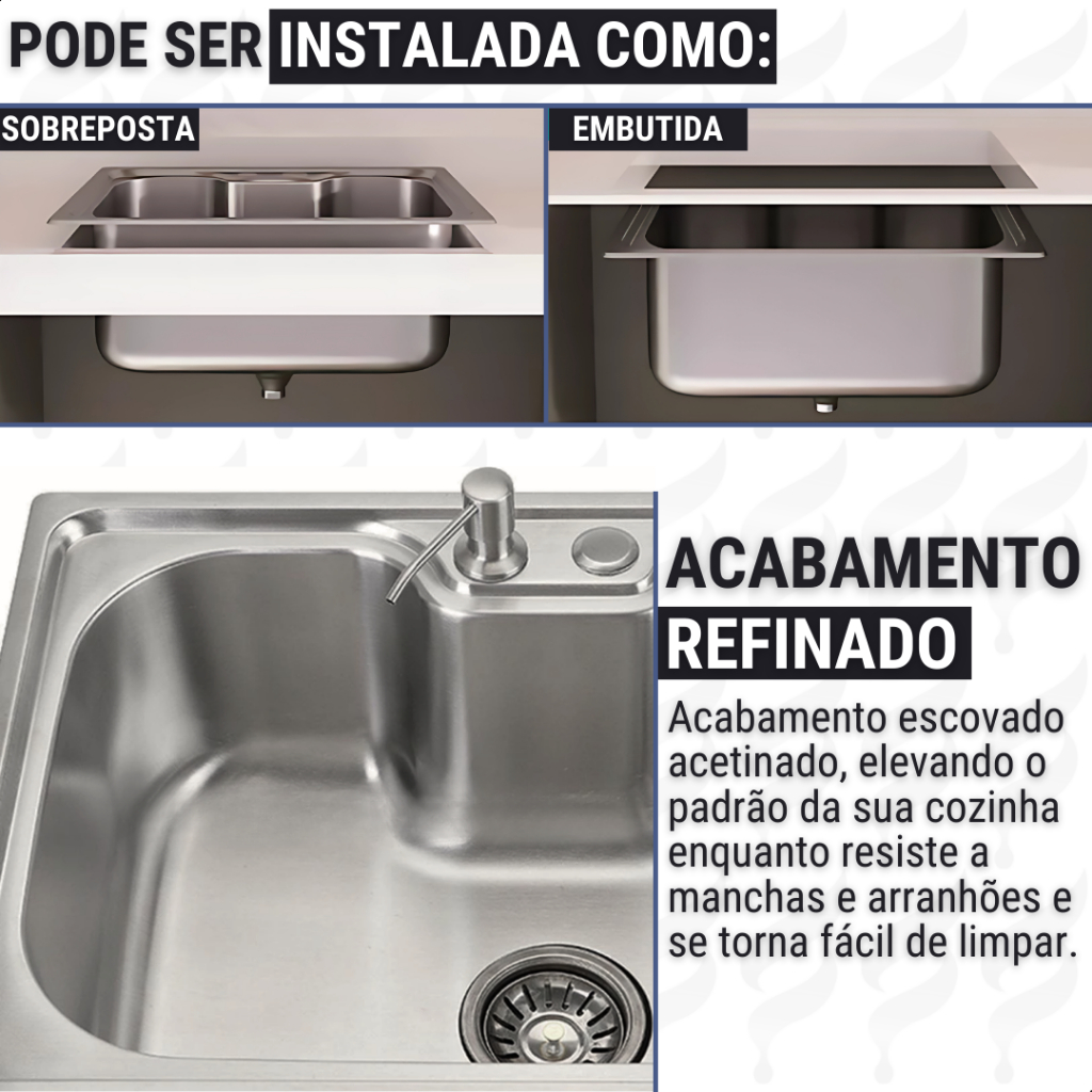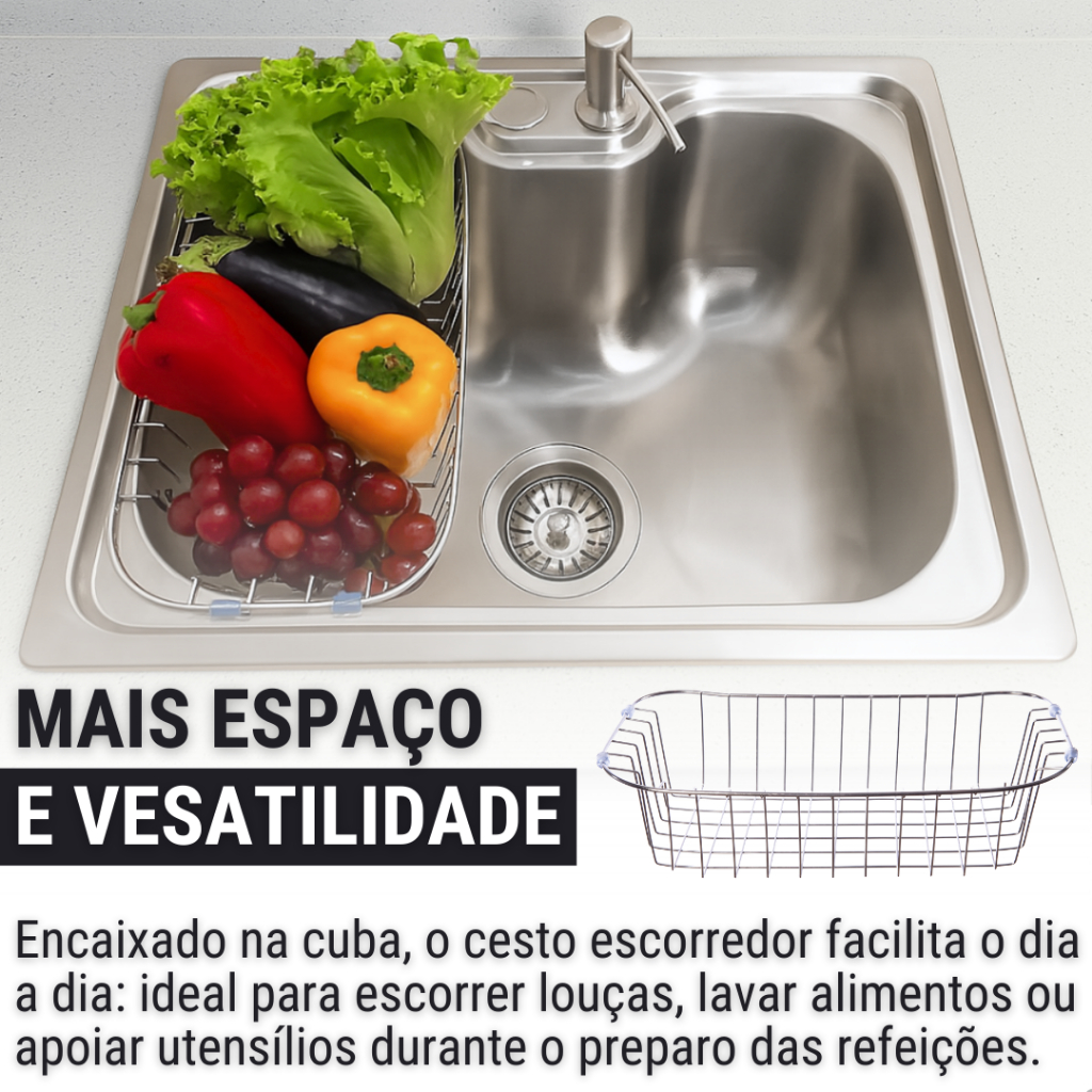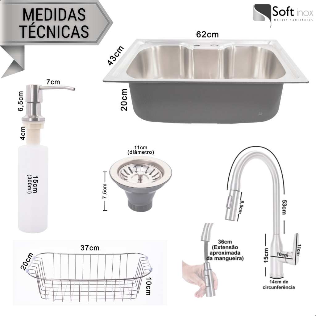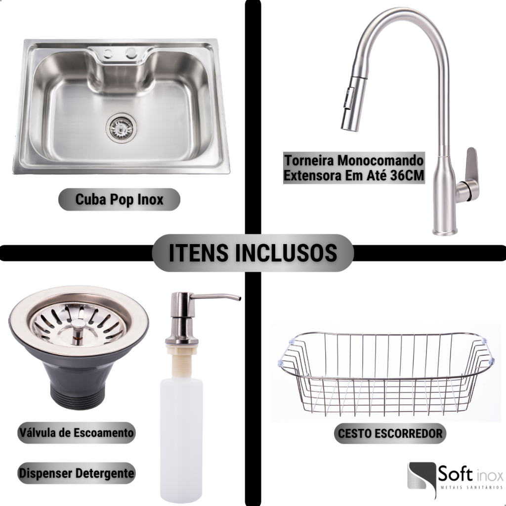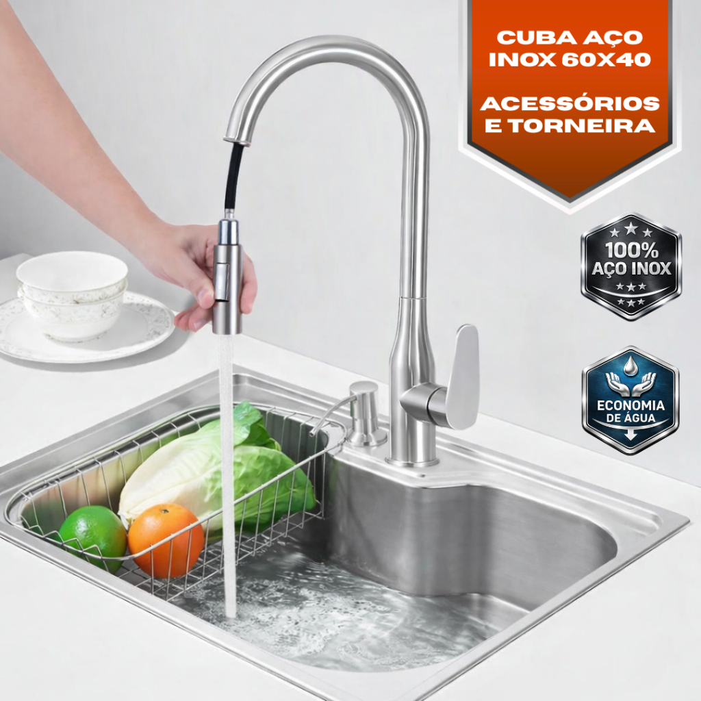 Kit Cuba Pia Cozinha Gourmet Aço Inox 60x40 C/ Torneira Escovada Extensora Monocomando e Acessórios