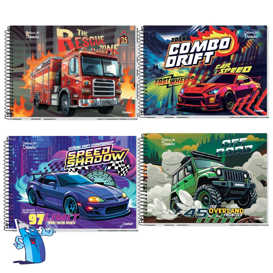 CADERNO DE DESENHO CARROS CAPA DURA 80 FOLHAS MASCULINO CREDEAL