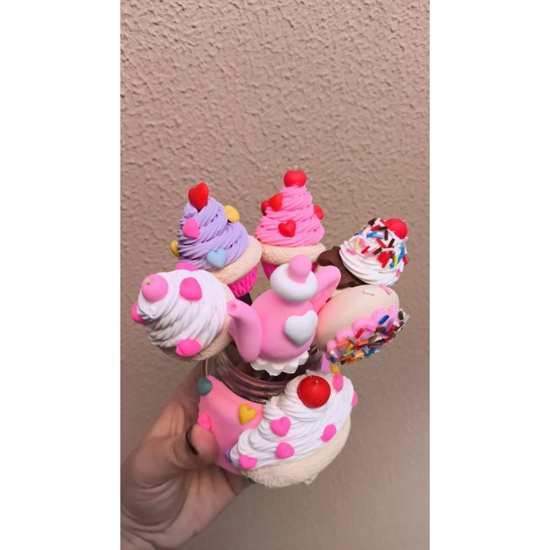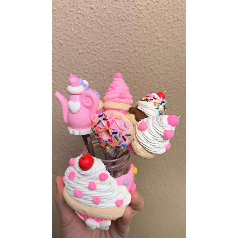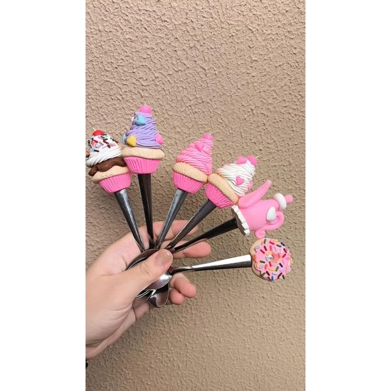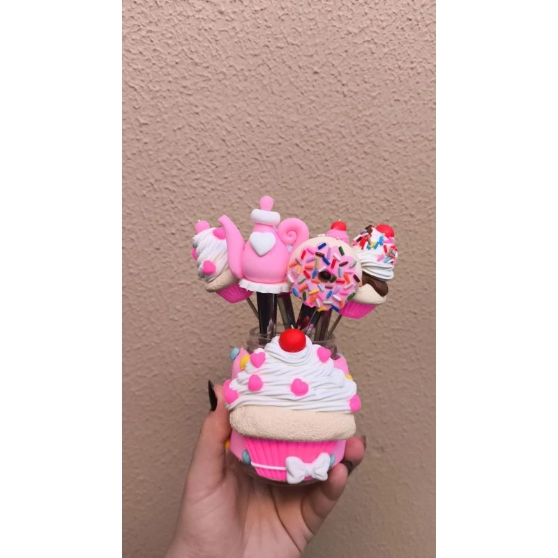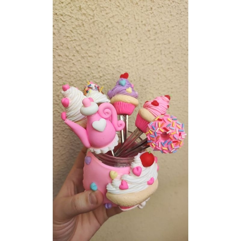Combo Cantinho do Café Rosa Pote com 6 Colheres Decoradas em Biscuit
