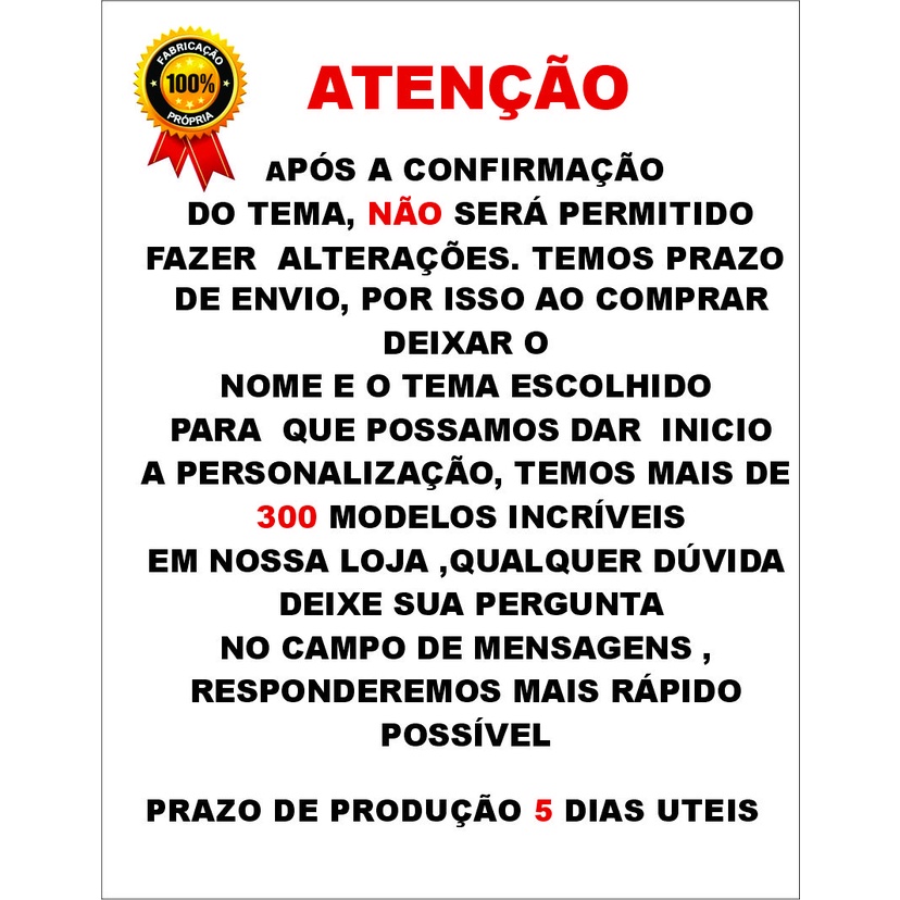 Sob encomenda: envio após 7 dias da compra