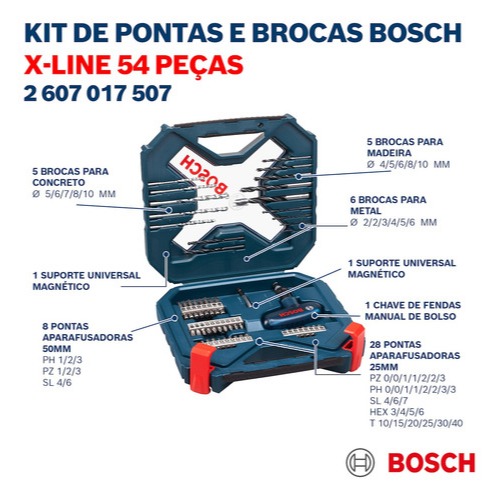 Kit Jogo de Brocas e Bits Bosch X-line 54 Peças com Maleta
