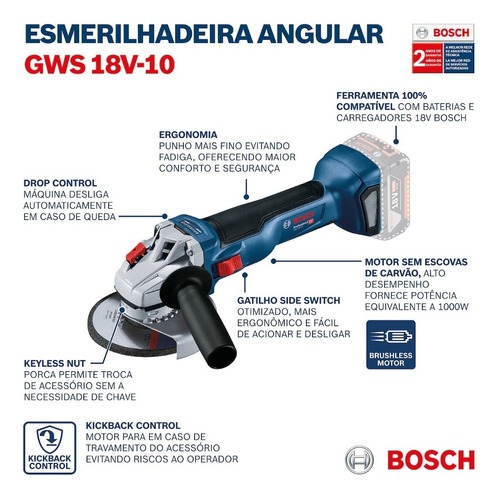 Esmerilhadeira Sem Fio Bosch GWS 18V-10 + Bateria 2A + Carregador