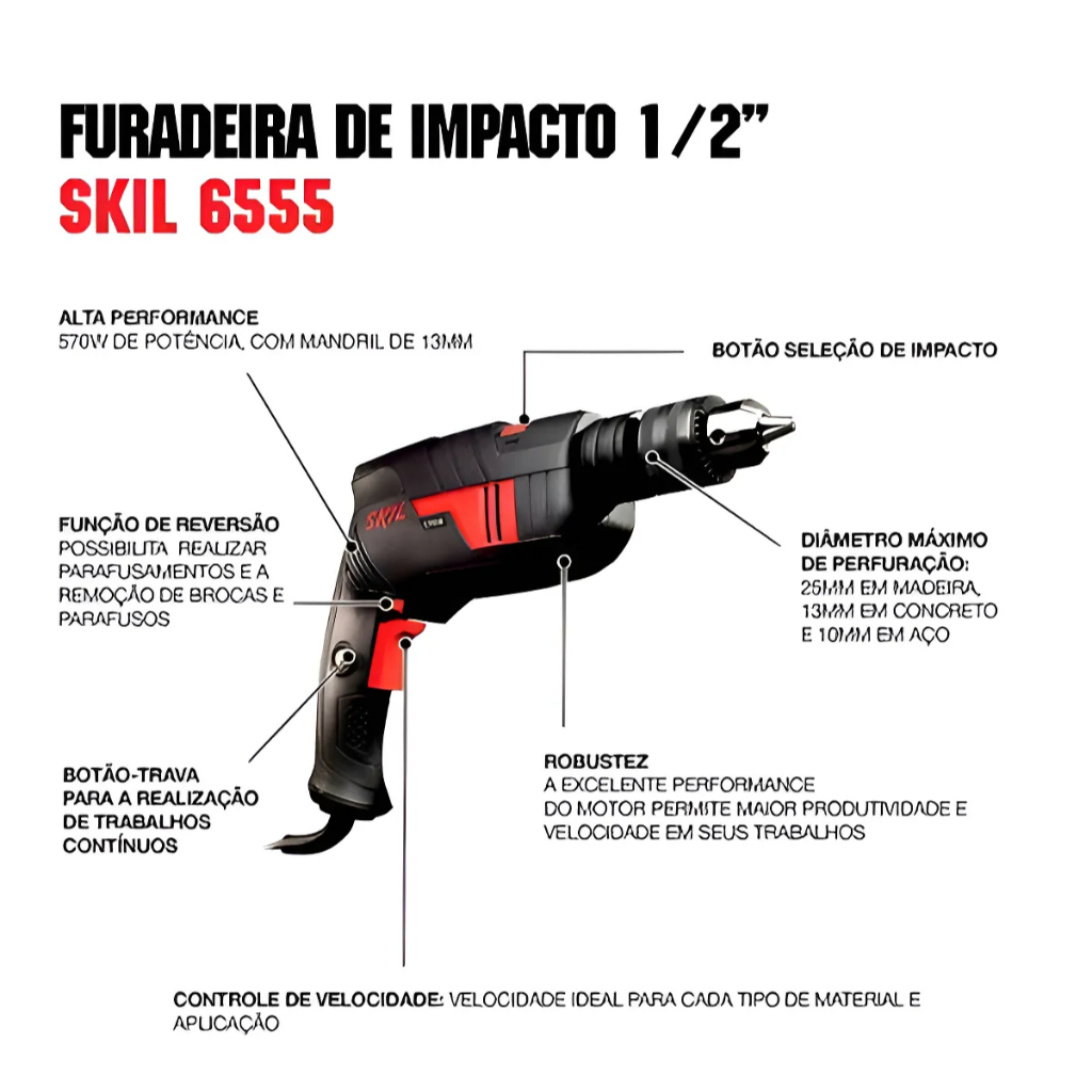 Furadeira Impacto Skil 6555 570W 220V + 10 Brocas e Bits + Maleta De Transporte