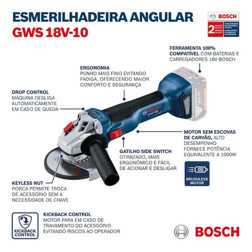 Esmerilhadeira Angular Bosch GWS 18V-10 Brushless Sem Bateria