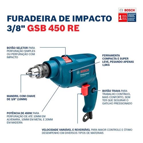 Furadeira Impacto Parafusadeira Bosch GSB 450 RE 127v + Kit 15 Brocas + Bolsa