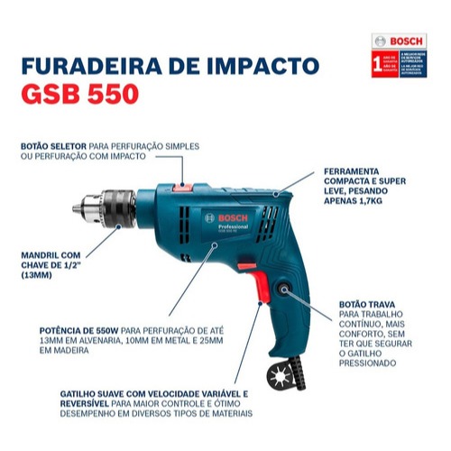 Kit Furadeira Impacto Bosch GSB 550 RE 220v + V-Line 41 Peças Brocas e Pontas
