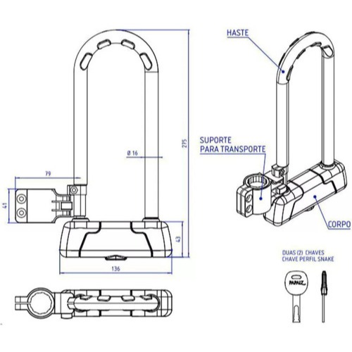 Cadeado Trava Bicicleta Moto Com Cabo Papaiz Tipo U-lock UL10/285