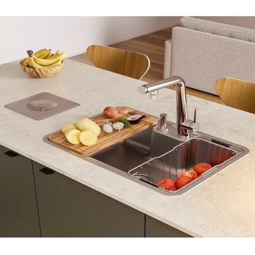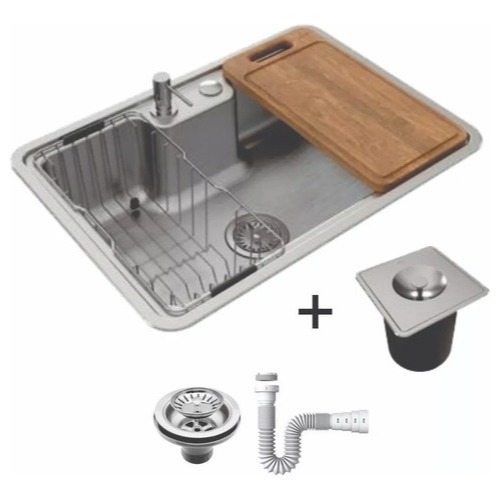 Cuba DocolMassima 64 x 44 cm Embutir/Sobrepor Inox 304 Escovado + Lixeira + Tábua + Cesto + Sifão