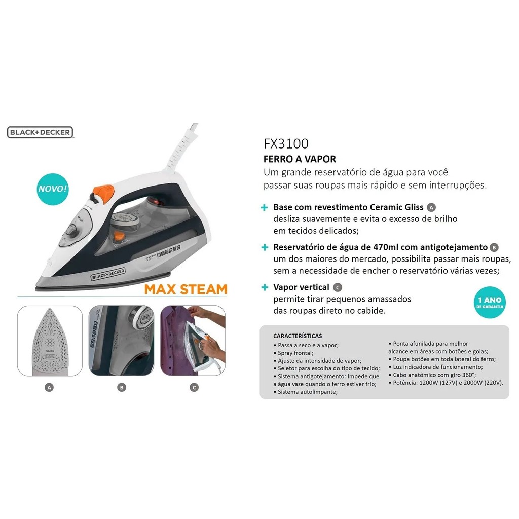 Ferro De Passar Roupa Black Decker A Vapor 2000w ou 1200w FX3100 com ANTI GOTEJAMENTO autolimpante