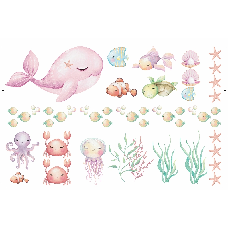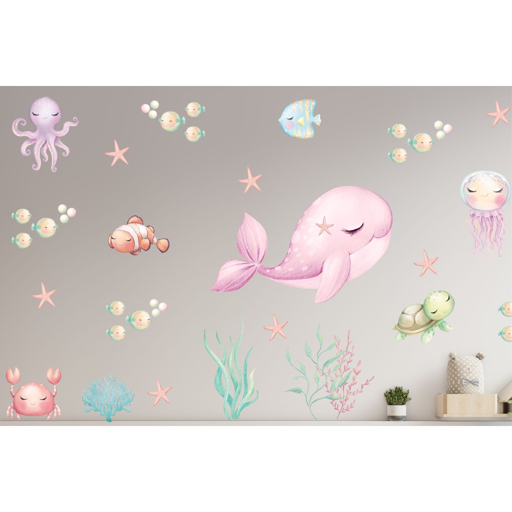 Adesivo Parede Baleia Rosa e Frutos do Mar Vida Marinha Papel de Parede Infantil Individual ou KIT